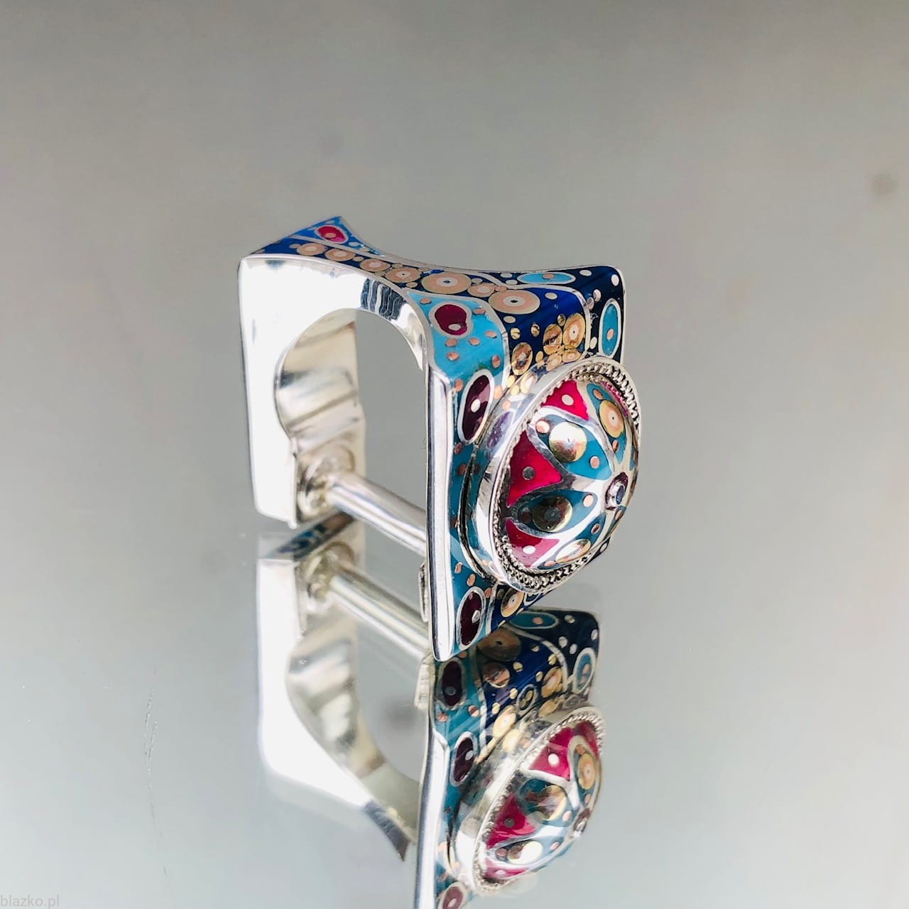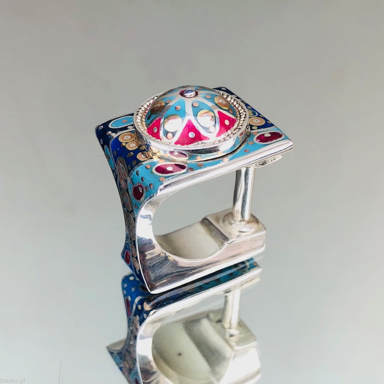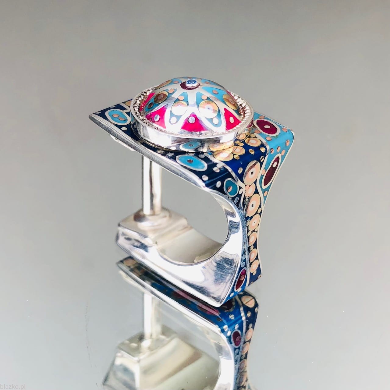 New unique ring decorated with unrepeatable blue & fuchsia DolceVita acrylic patterns and covered with a dome. Intriguing asymmetry with one side as a column, very architectural in look, comfortable in wear.