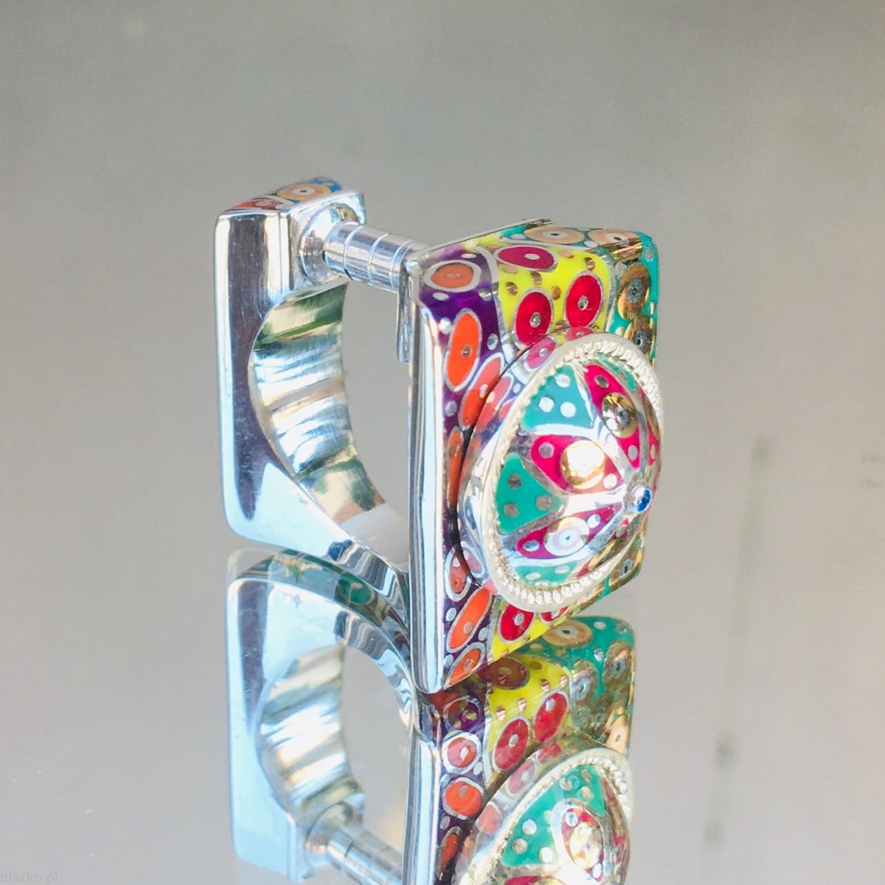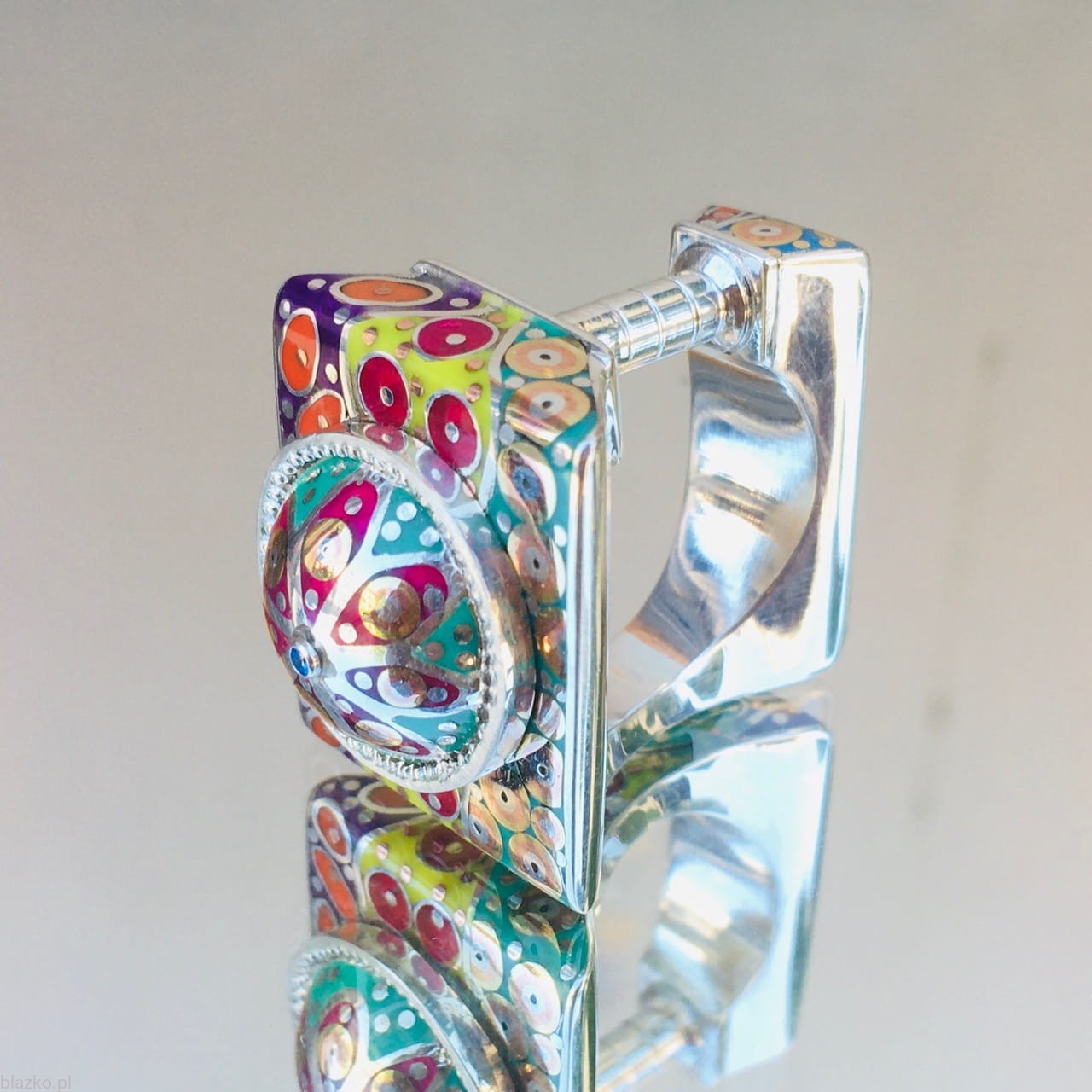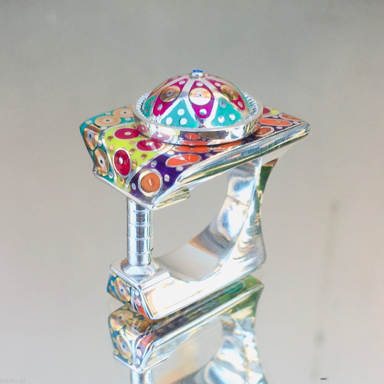 New unique ring decorated with unrepeatable colourfull DolceVita acrylic patterns and covered with a dome. Intriguing asymmetry with one side as a column, very architectural in look, comfortable in wear.
