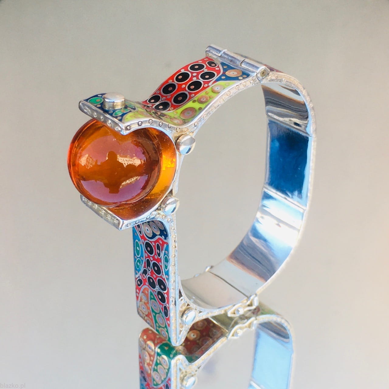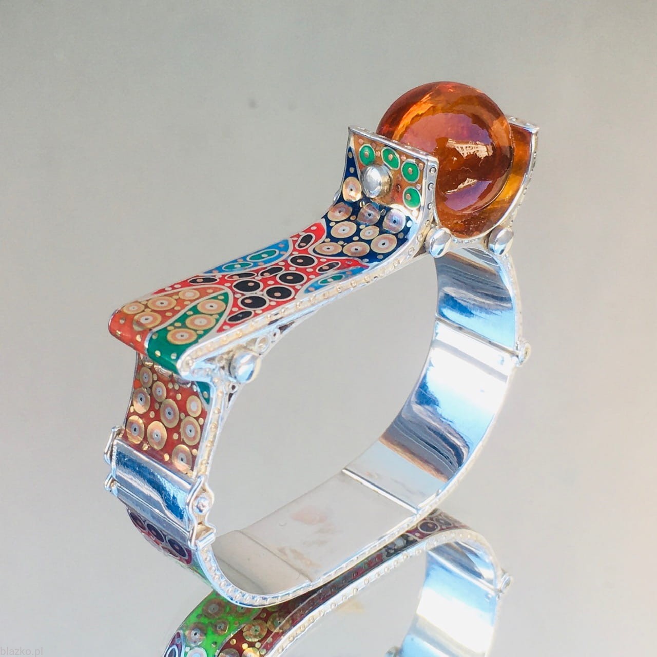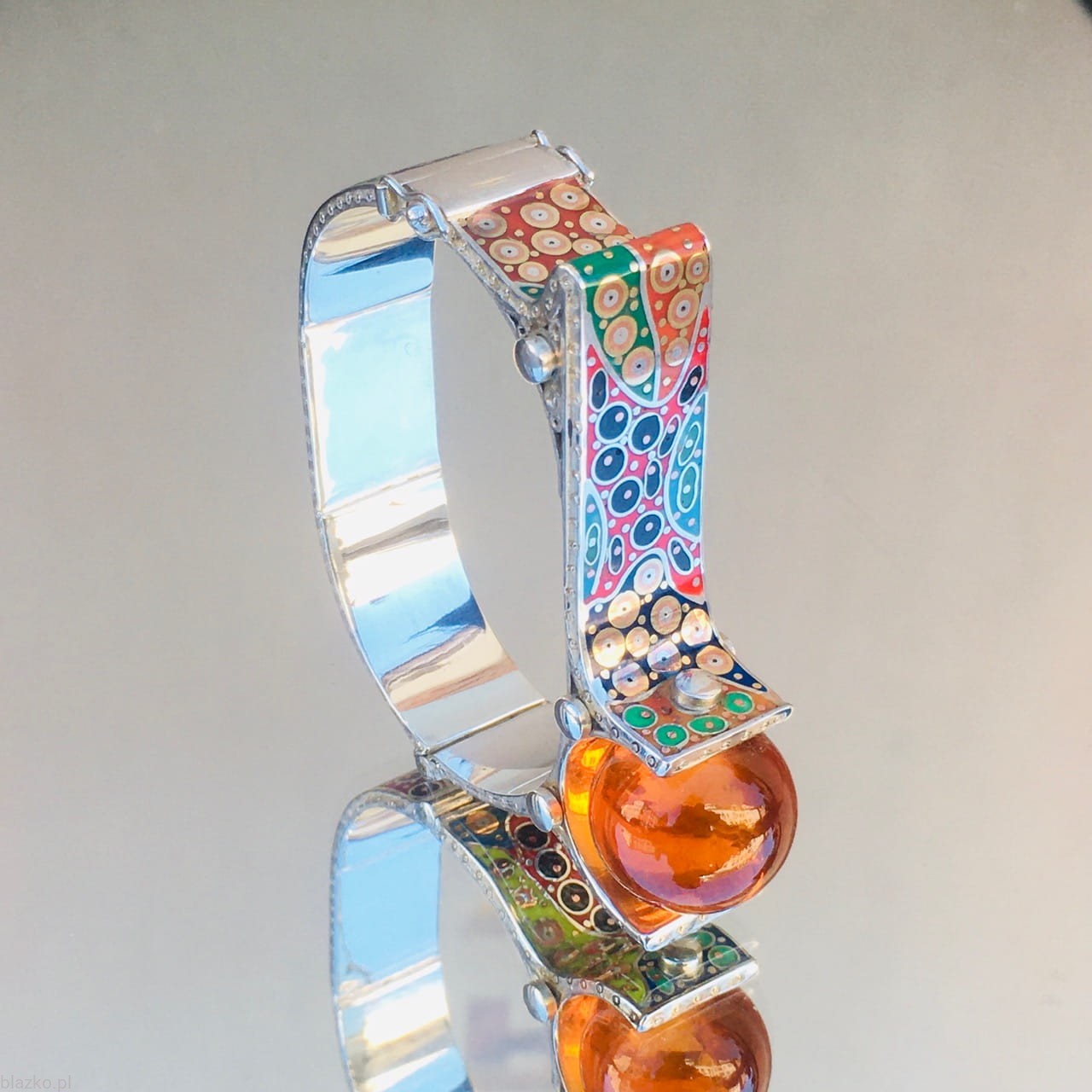 New one-off piece of the Latest Collection of Unique bracelets. An owal shape with a flat top, finished with a large (18 mm) high quality baltic amber placed asymetricaly on the side, The whole surface of the bracelet is about 1,5cm wide is all covered with unrepeatable DolceVita patterns of coloured acrylic, some brass and copper.