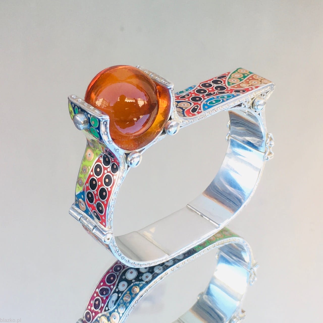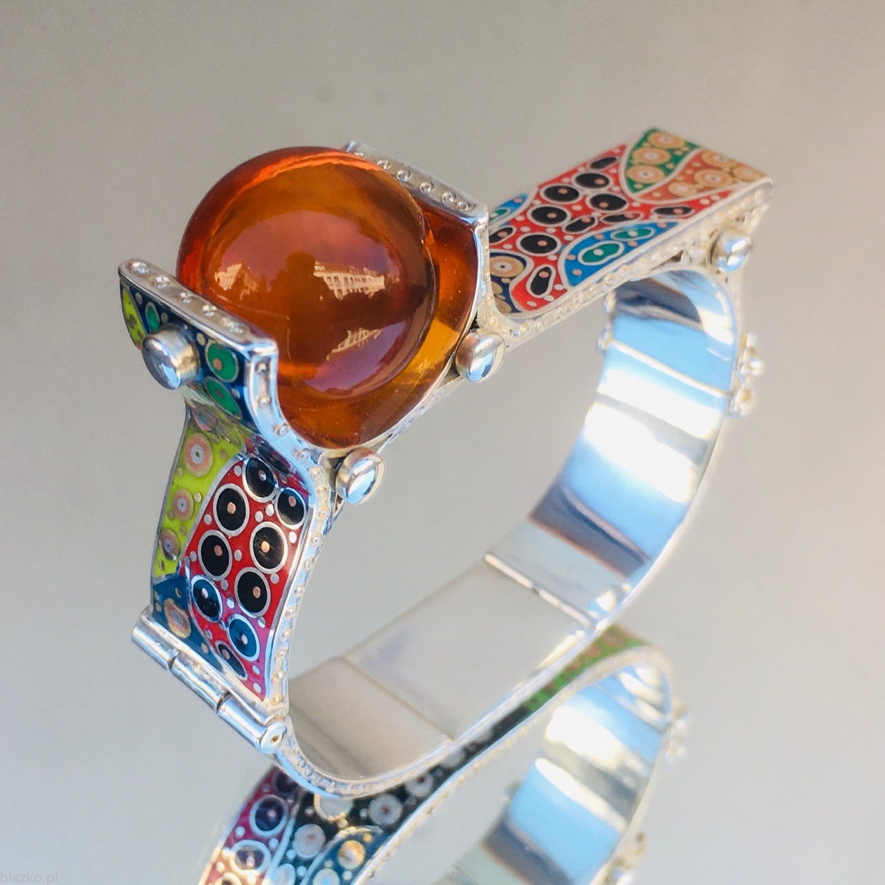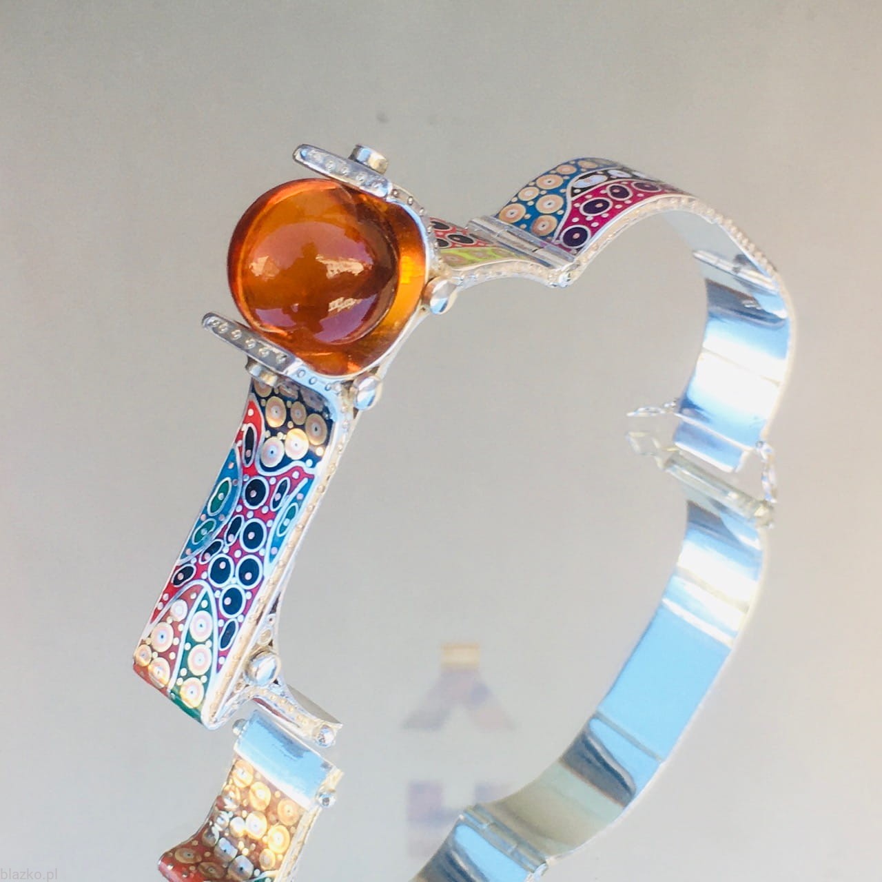 New one-off piece of the Latest Collection of Unique bracelets. An owal shape with a flat top, finished with a large (18 mm) high quality baltic amber placed asymetricaly on the side, The whole surface of the bracelet is about 1,5cm wide is all covered with unrepeatable DolceVita patterns of coloured acrylic, some brass and copper.