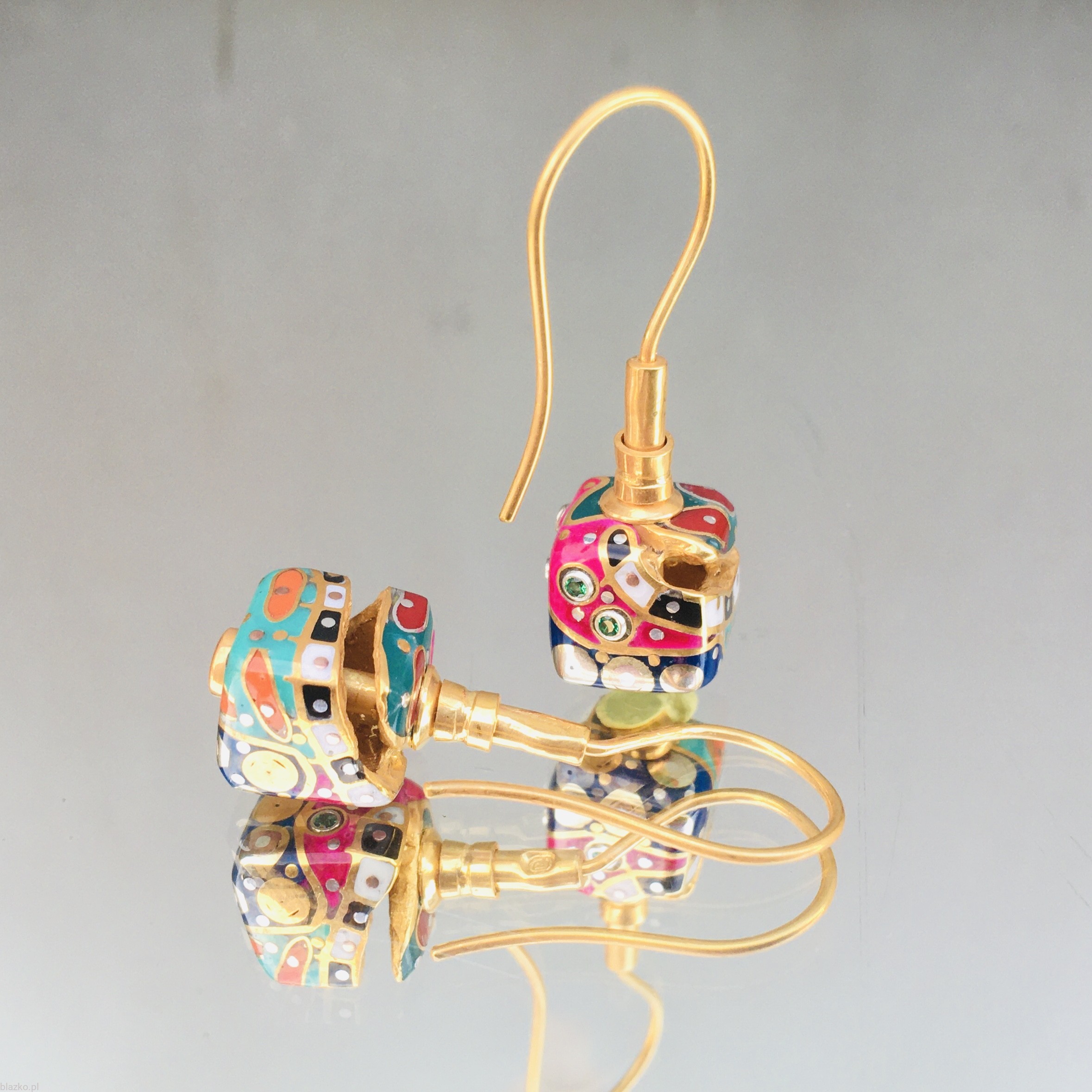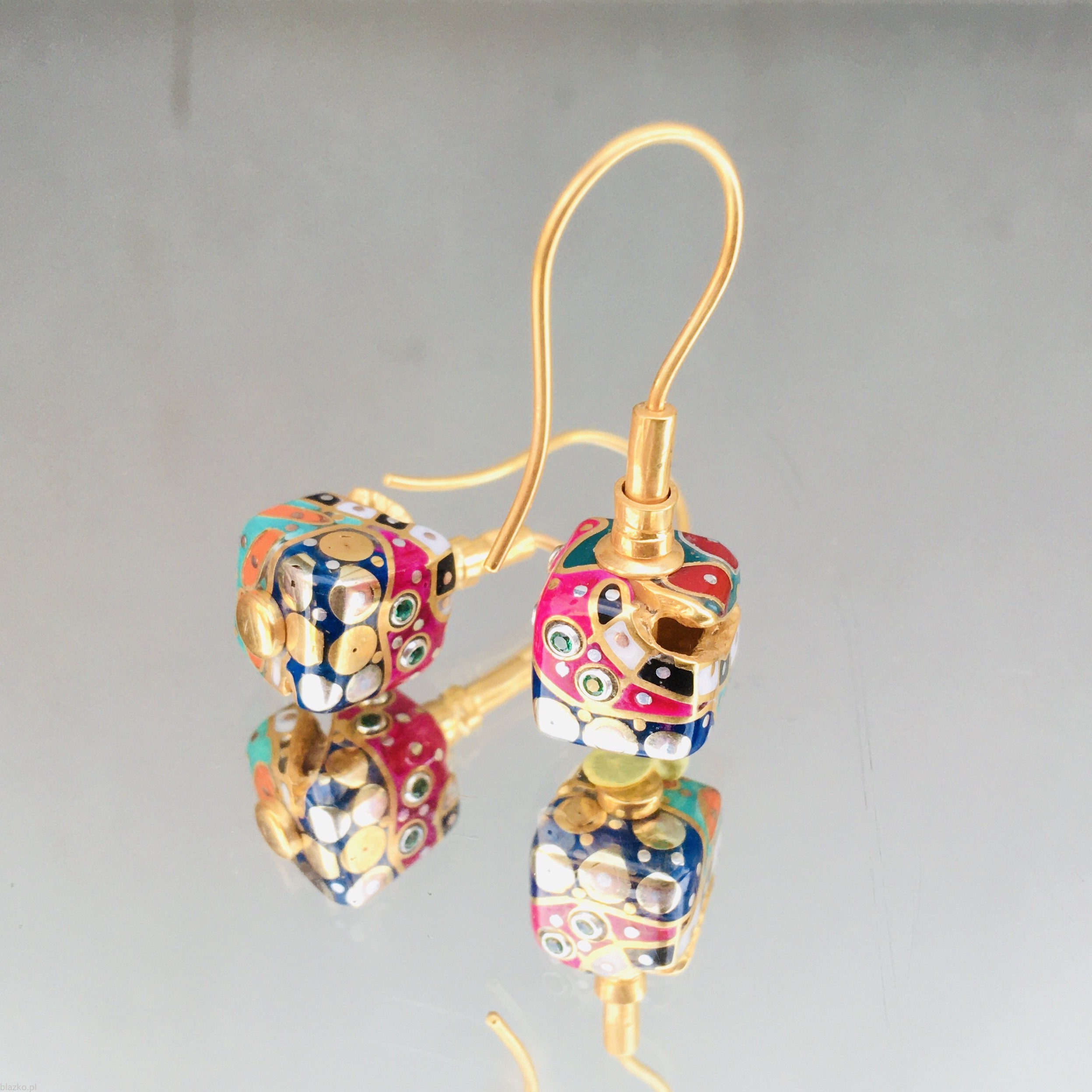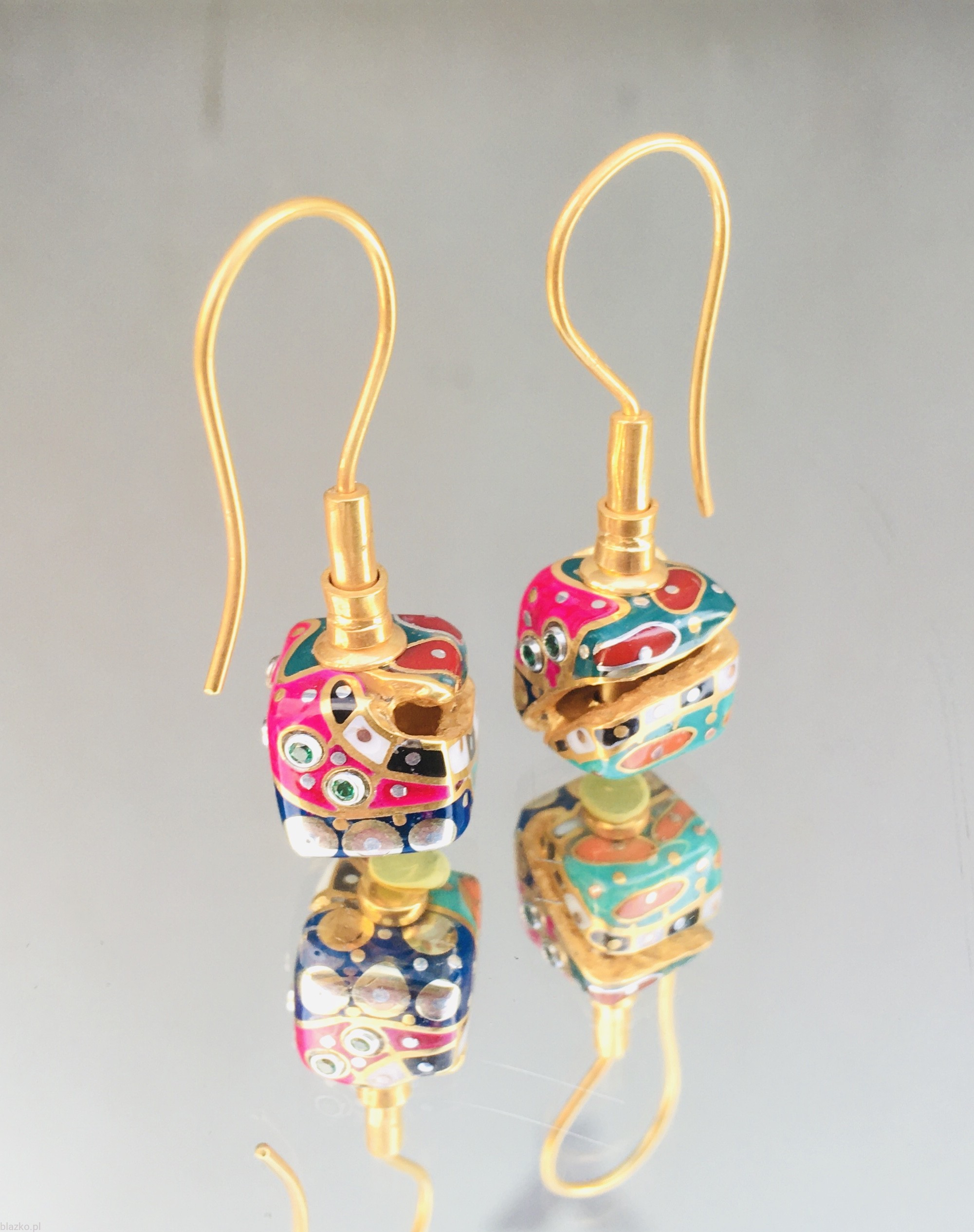 Silver Cubes of ca. 11 mm sides all covered with unrepeatable patterns of DolceVita Collection, handcrafted of coloured acrylic with some brass&copper, also decorated with a "crack" - a cut in their surface showing the inside of the structure, all covered with a fine gold-plate and hanging on a french-loop, total size ca. 11 mm x 3,7 cm and weight ca. 5 gr/each