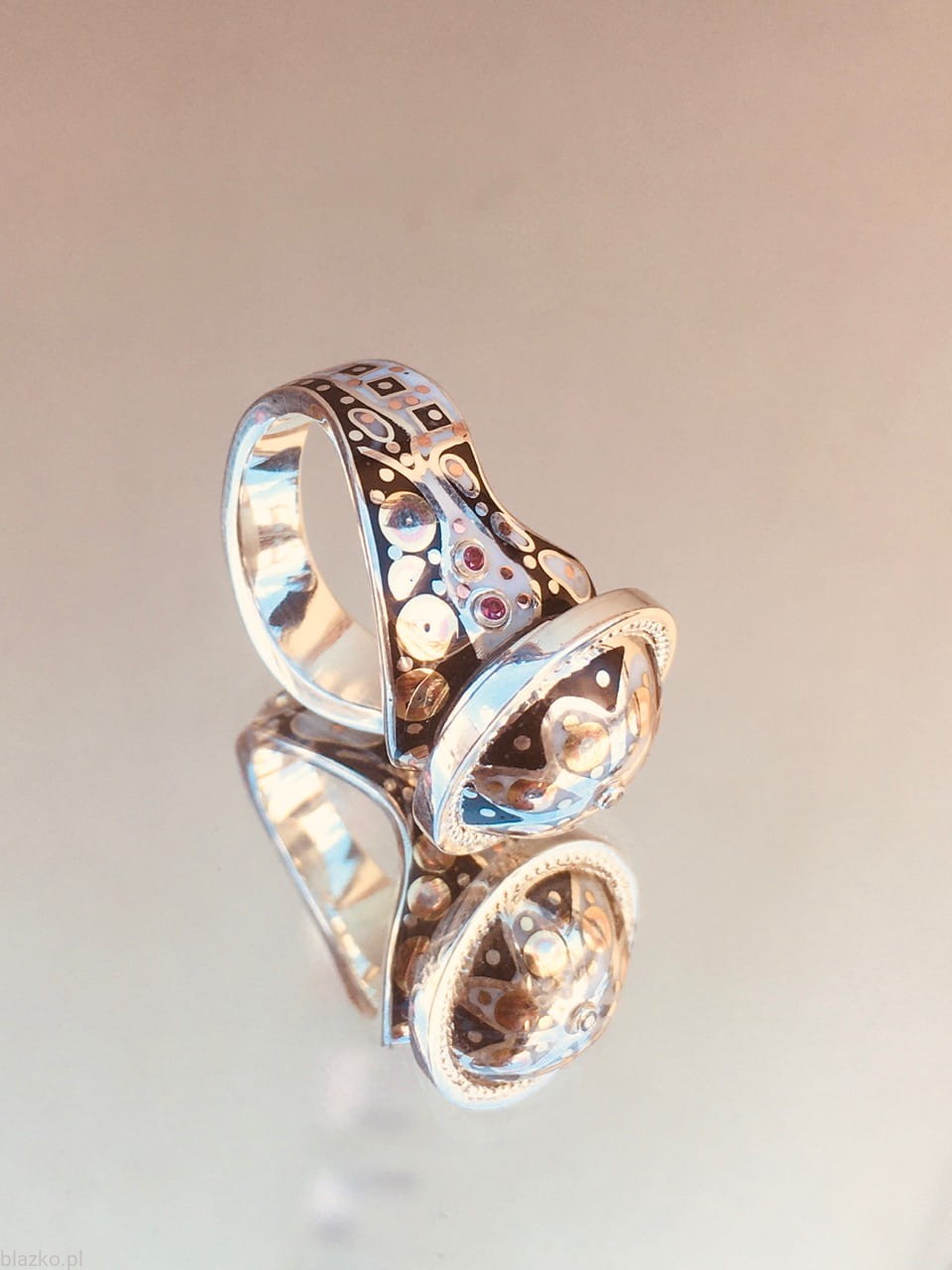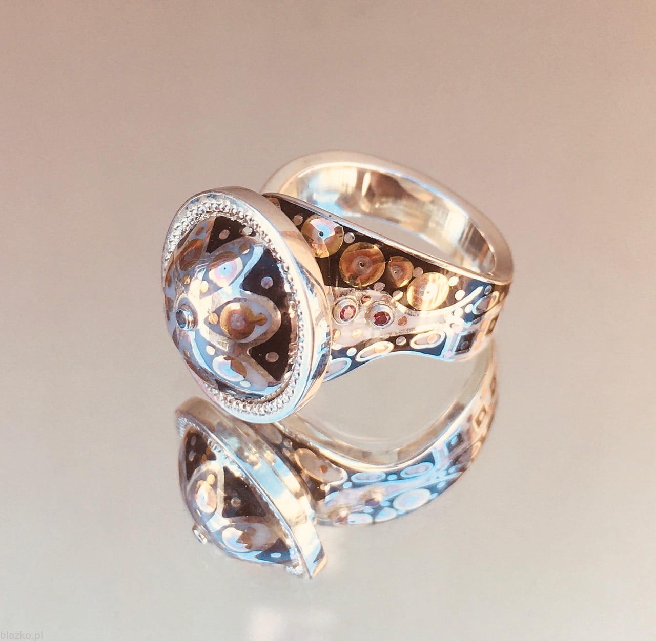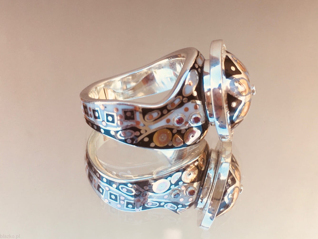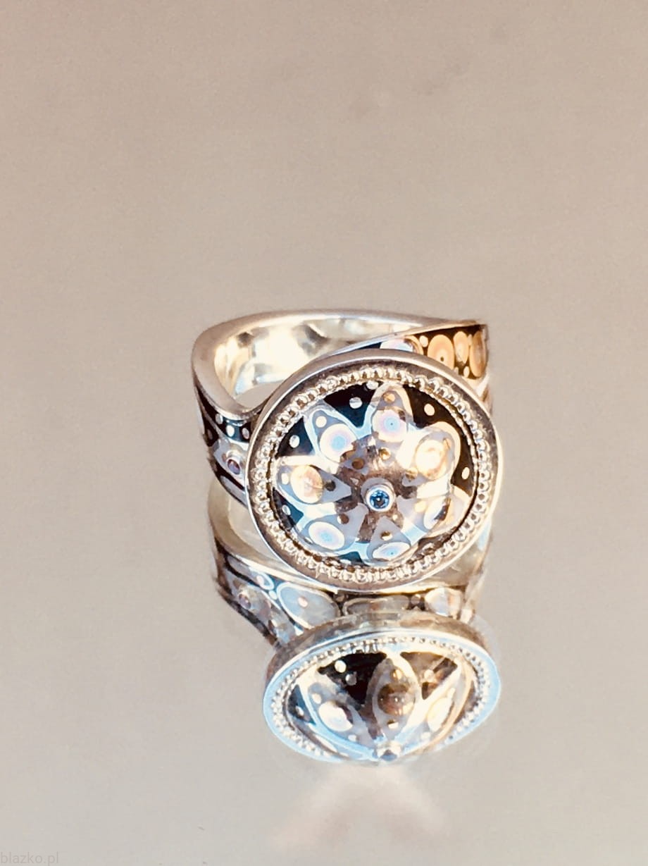 New asymmetric and wavy silver ring topped with a rosette-like dome, all covered with unrepeatable black&white DolceVita patterns of acrylic, some brass and copper.