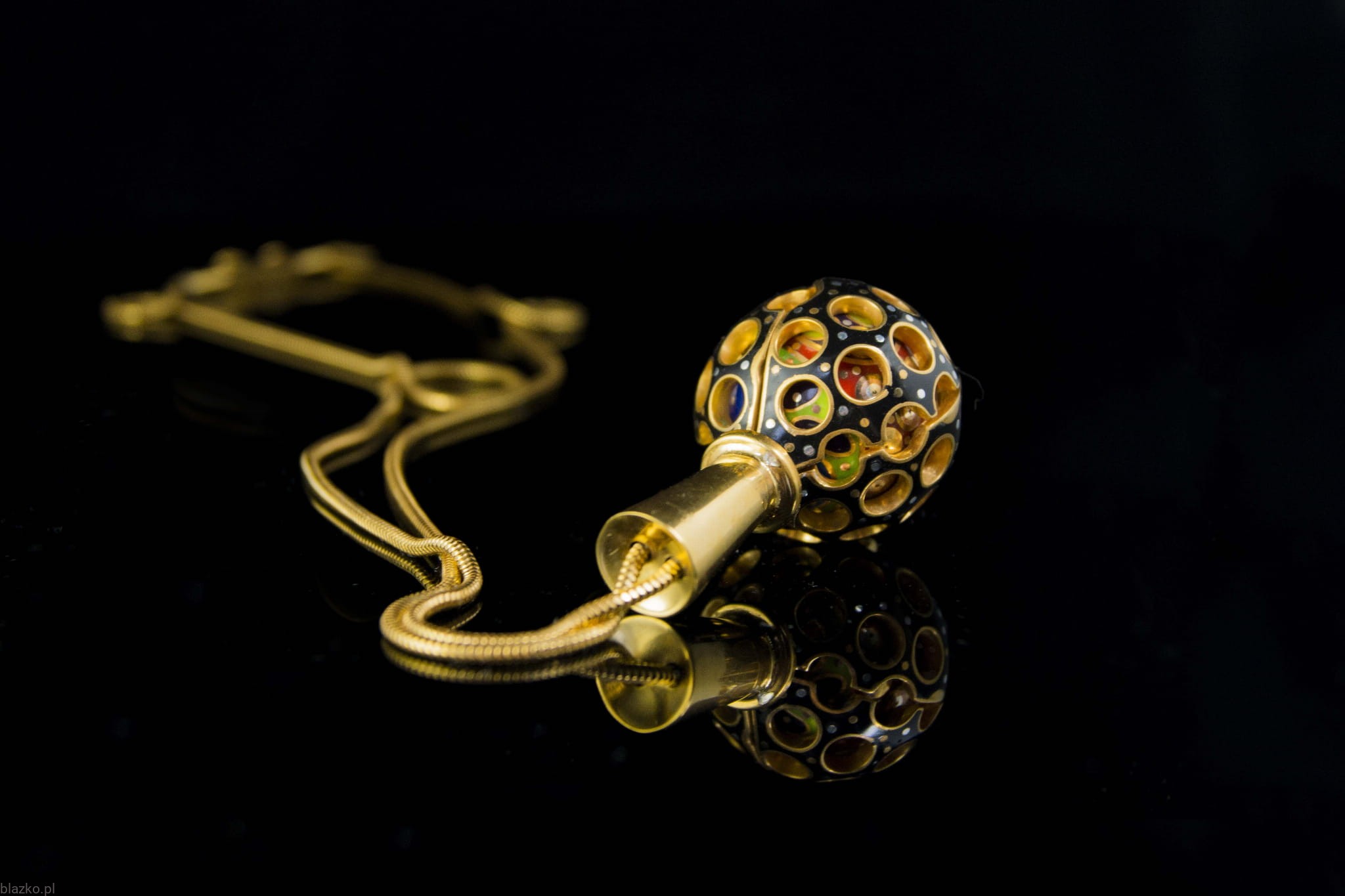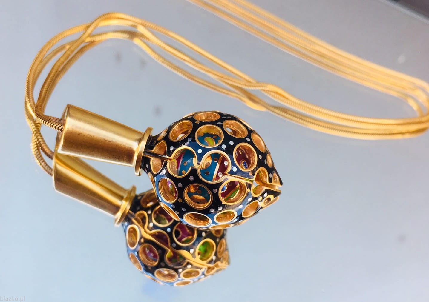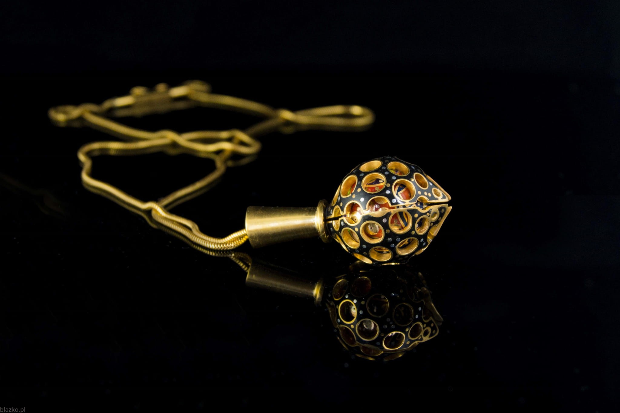 Sundew Pendant is another unique, gold-plated object made of silver, acrylic, small Svarowski crystals. A colourfull ball is hidden inside 4 black petals (total ca. 2,3x4,8cm) and is hanging on oxidized silver snake-chain ca. 50cm long.