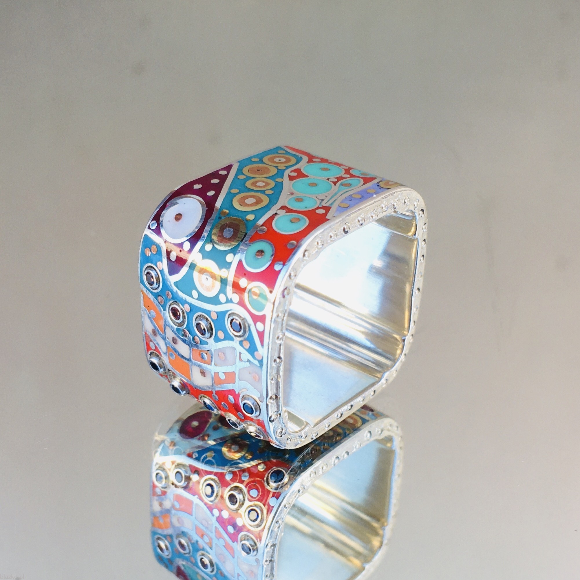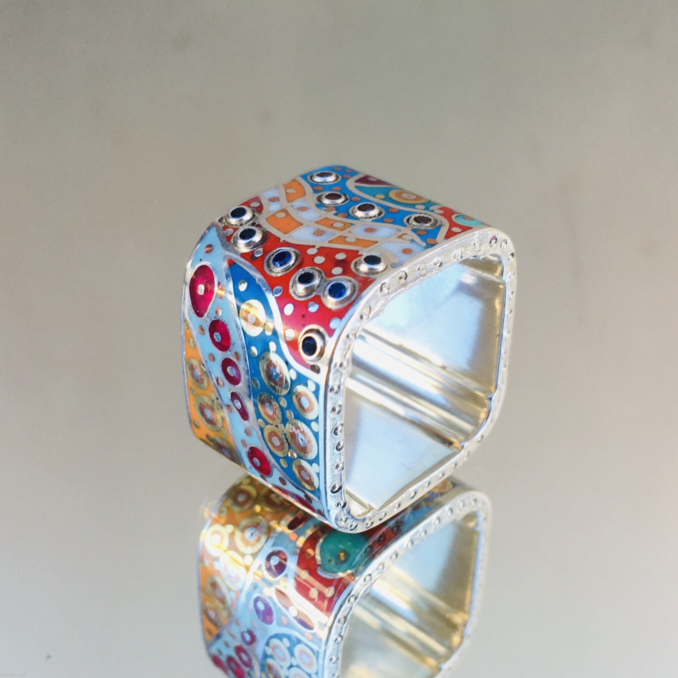"Praline" is a new ring ca. 16mm wide, a square but with not at all edgy, all covered with unrepeatable patterns of the DolceVita collection, handmade as as single model, each next model is not exact copy but follows same style, patterns and colours.