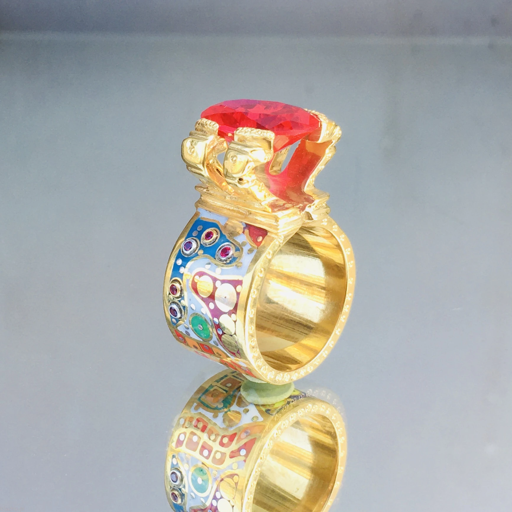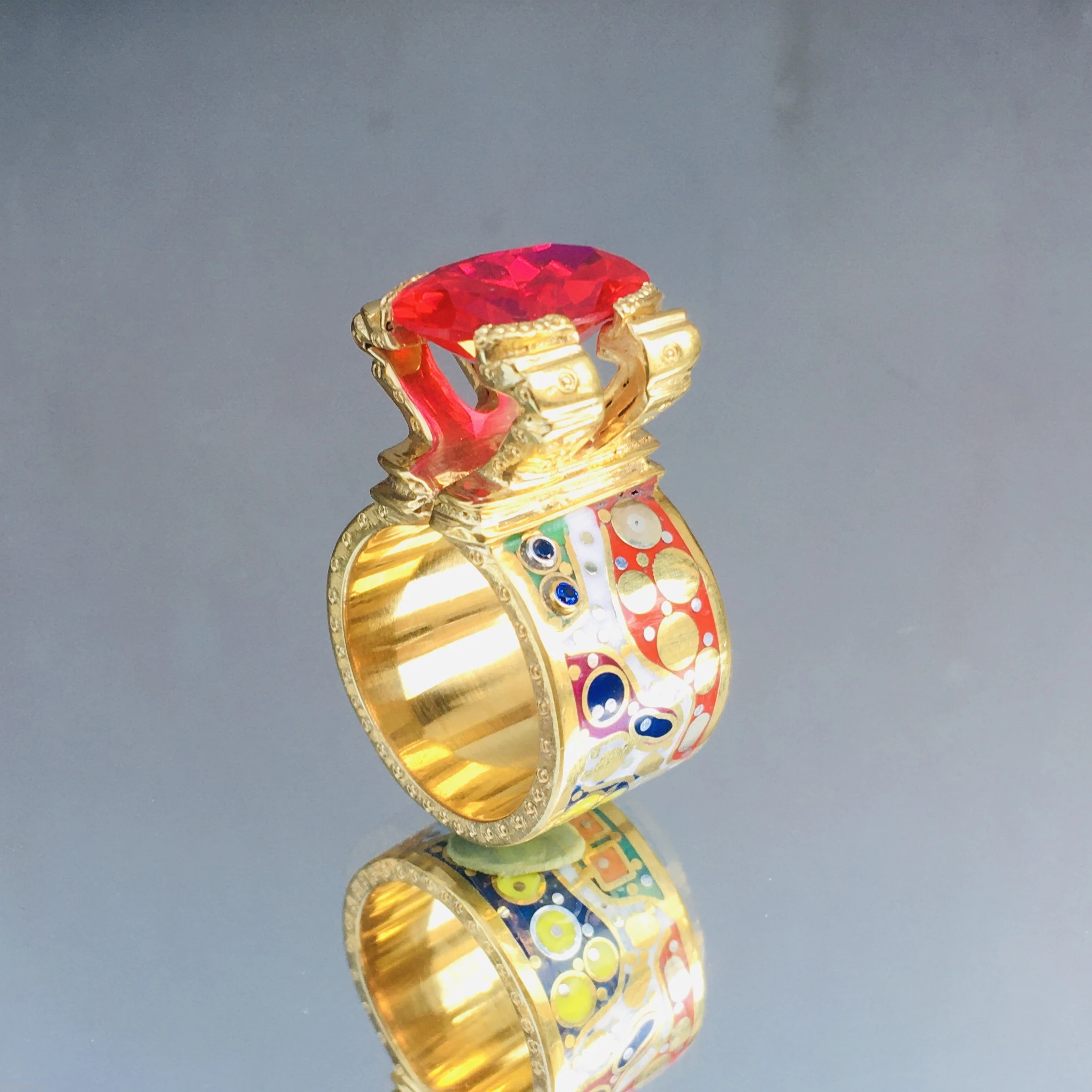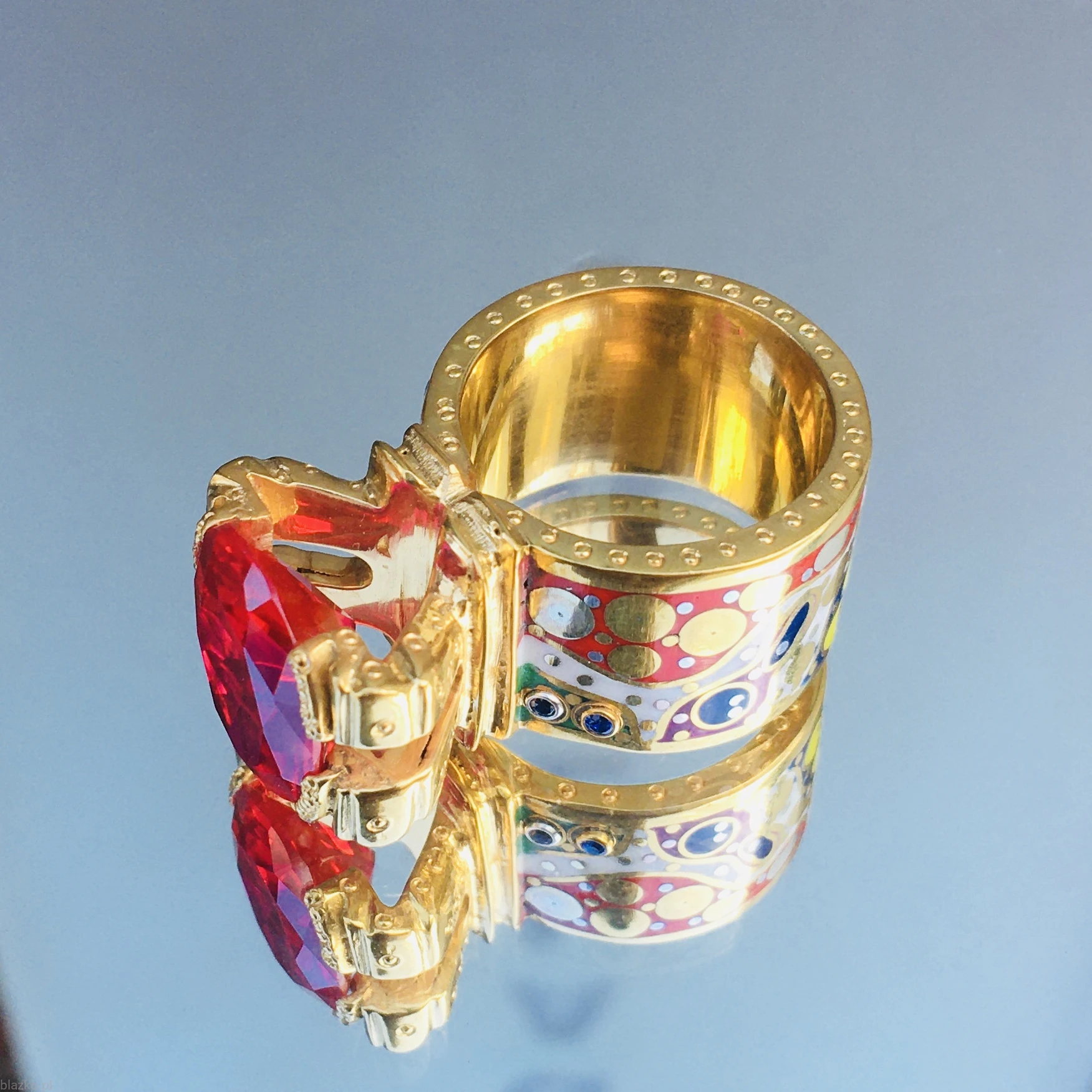 New unique, wide ring (approx. 14mm) with unrepeatable patterns of the Blazko DolceVita collection adorned on its sides, and a striking finial crowned with an intensely red synthetic ruby. Handcrafted of sterling silver, coloured acrylic with some copper, brass, and tiny crystals, all covered with fine gold-plate. Available in a single piece, as shown in the photo, in size 15.