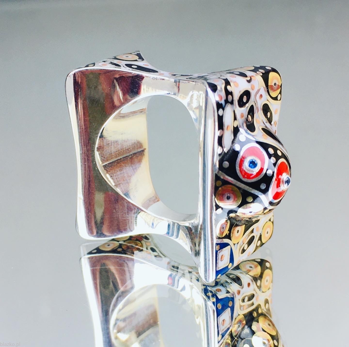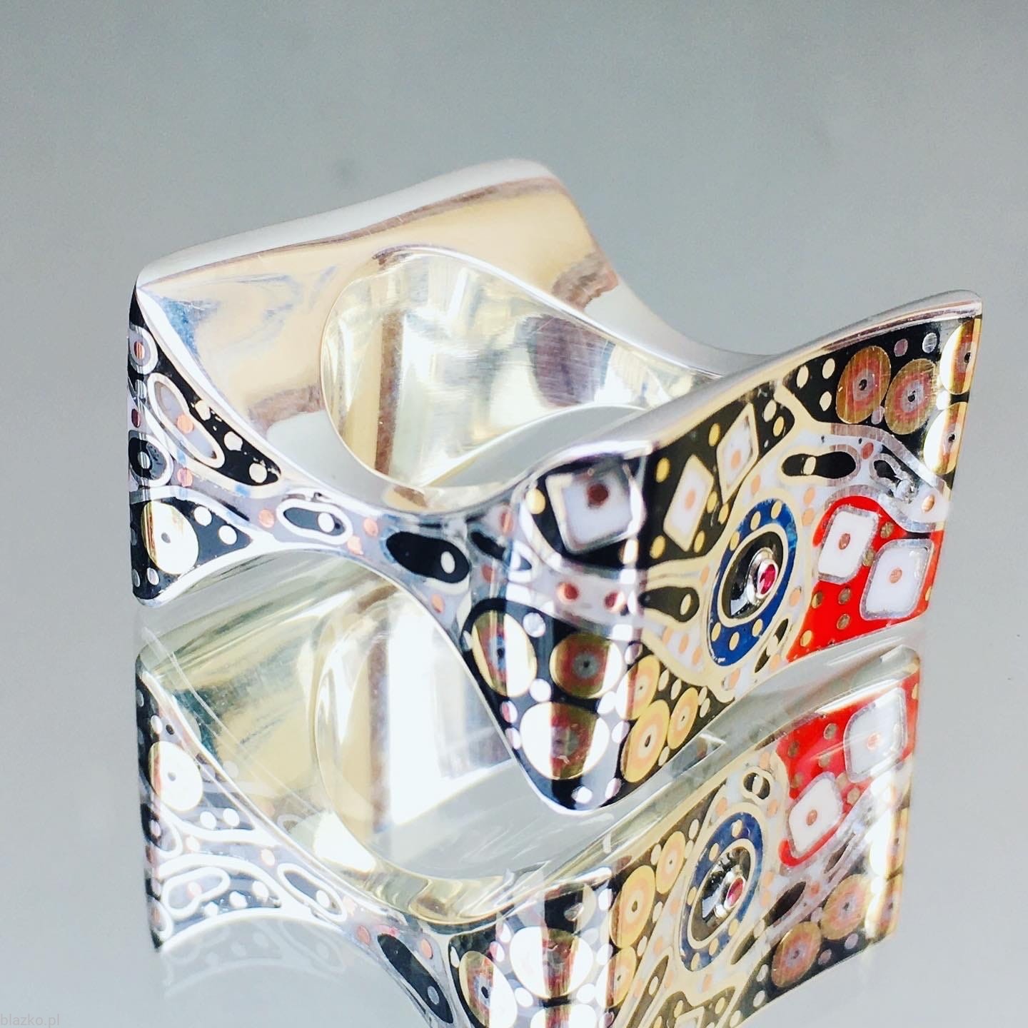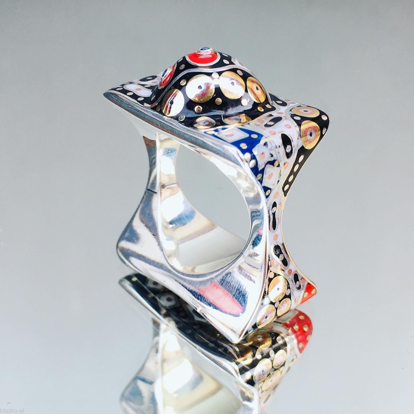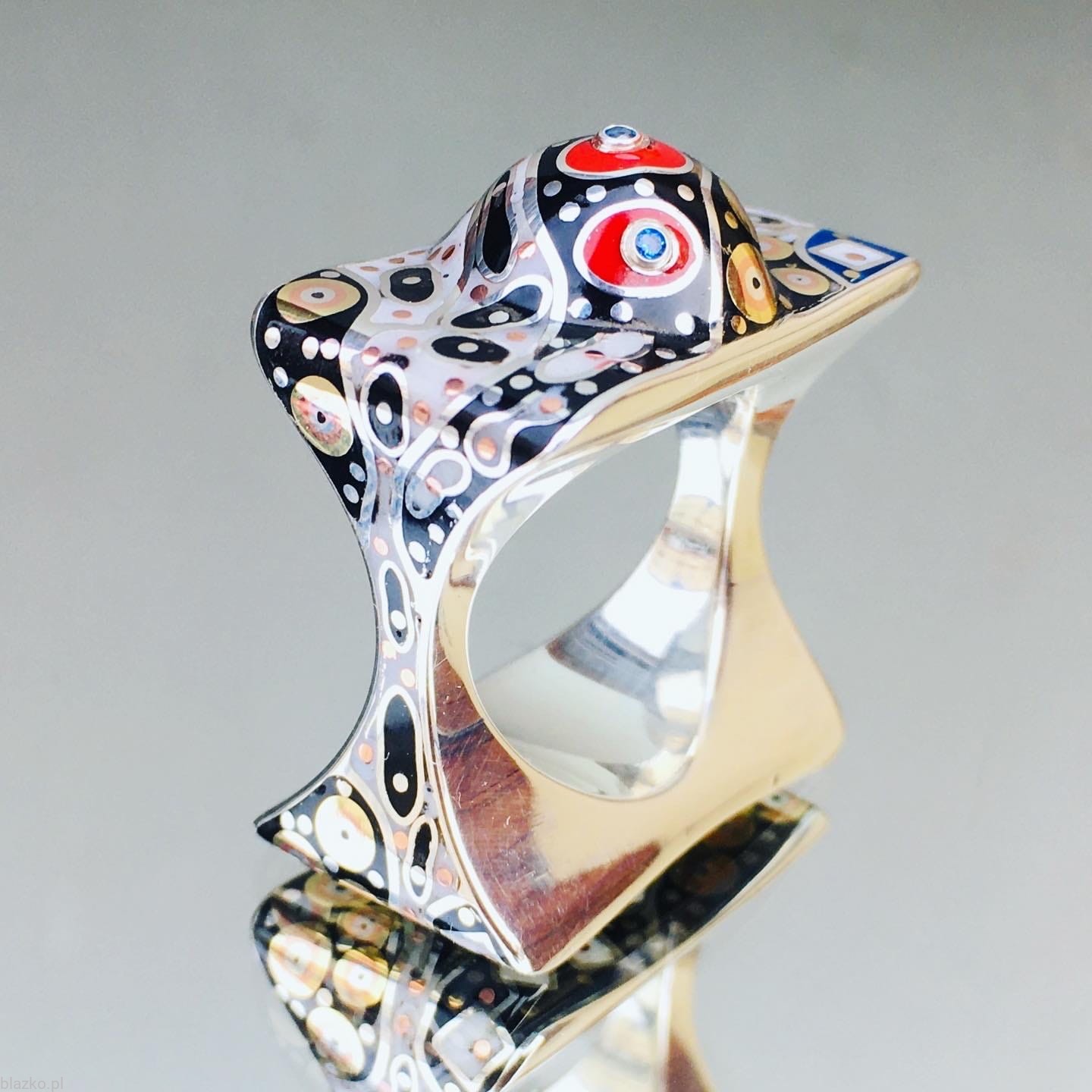 Bague Mandarin est fabriquée à la main, d’argent, d’acrilic, d’éléments en laiton et en cuivre et décorée de petits cristaux.