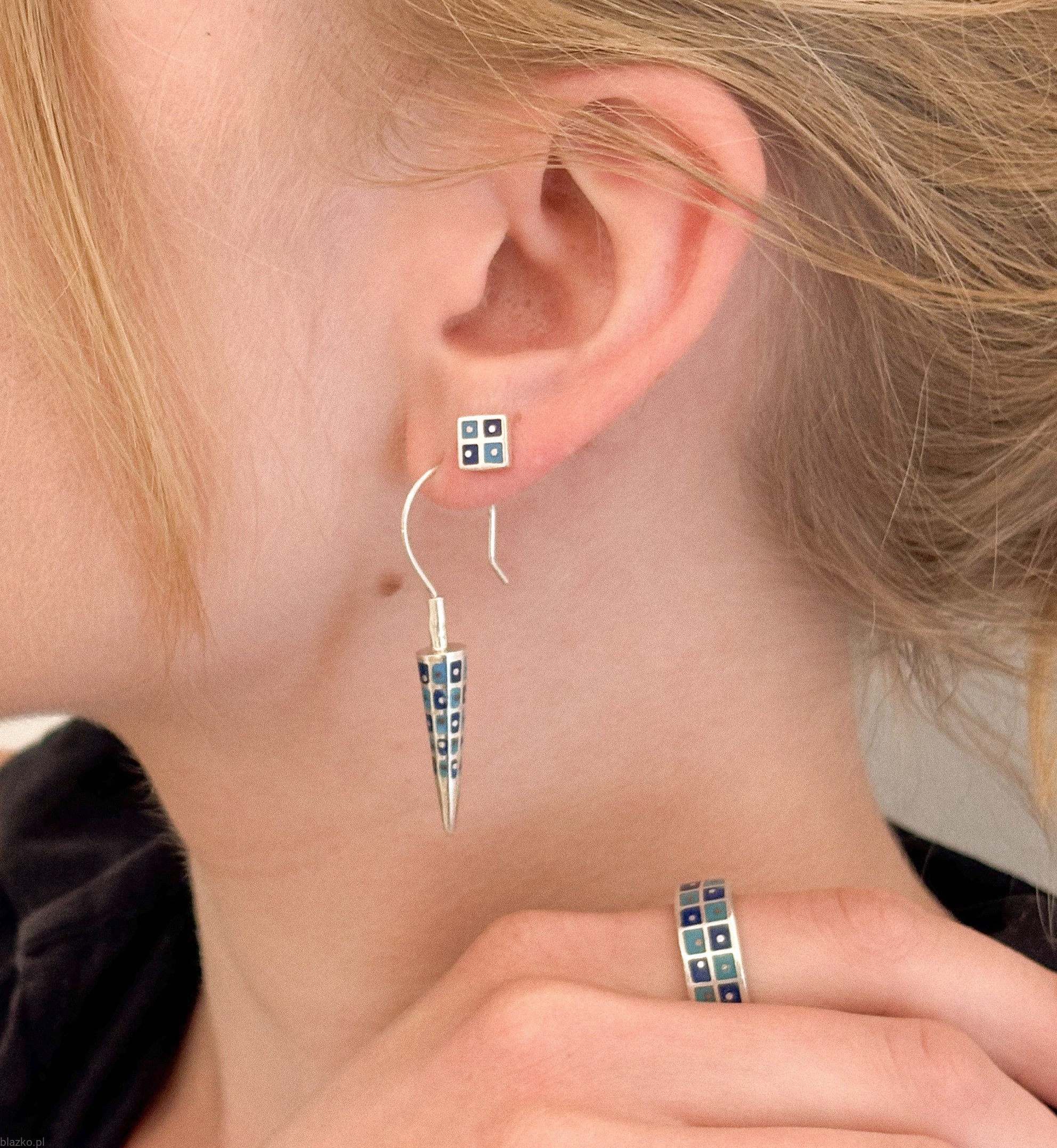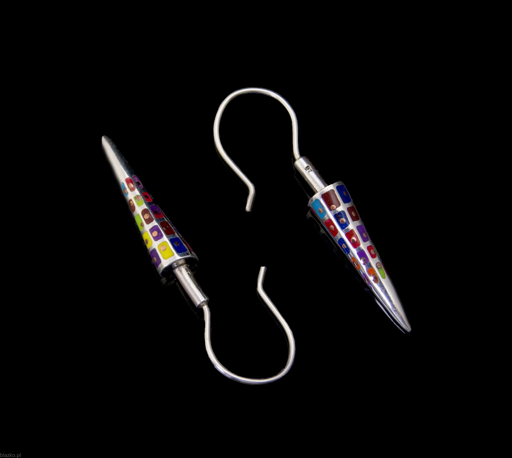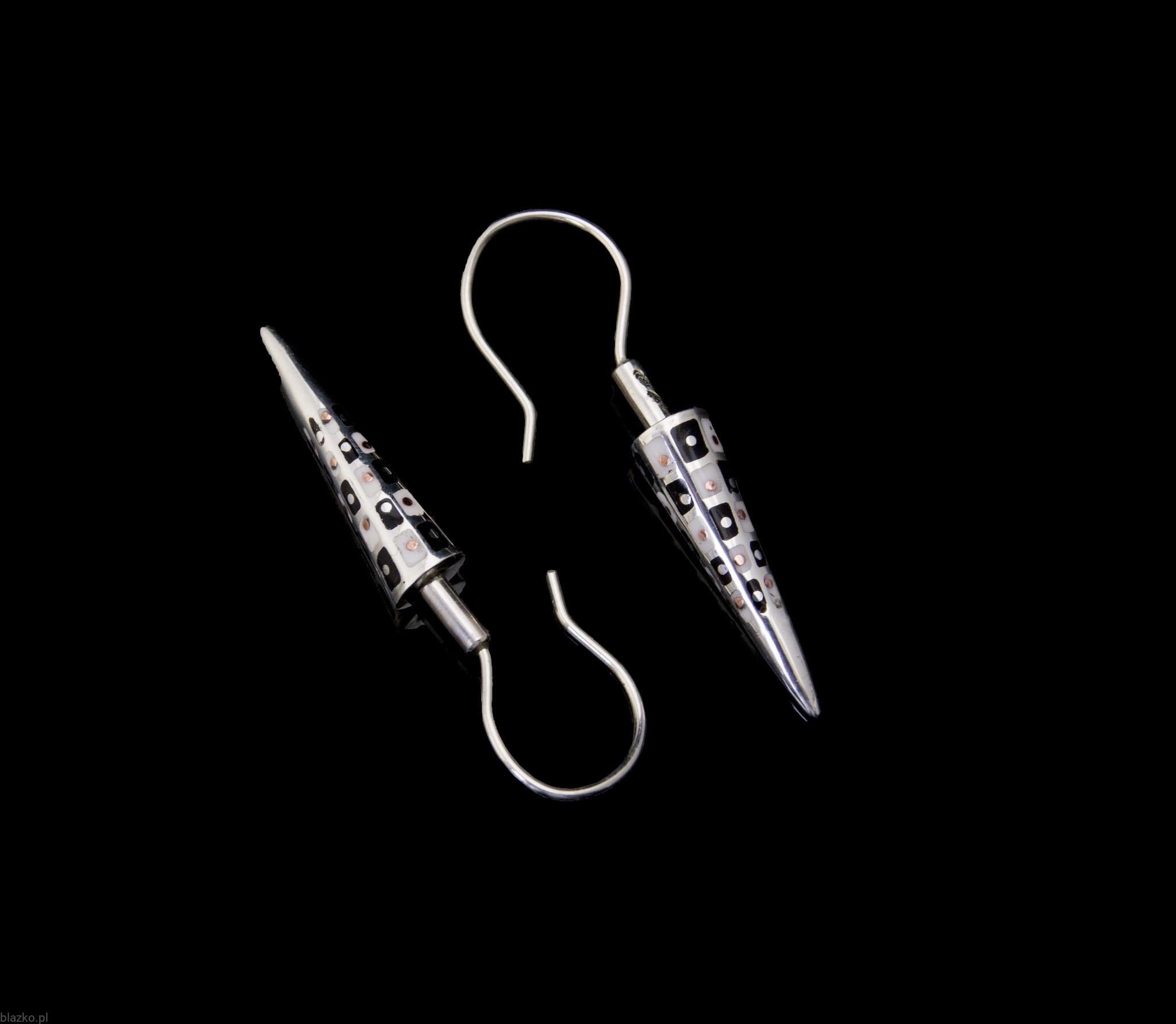 Strzałki zwane też parasolkami to kolczyki z kolekcji szachownicy wykonane ręcznie ze srebra, akrylitu i miedzianych detali, zawieszone na długim biglu, długość całości ok. 4,5 cm waga ok. 3,1 gr.