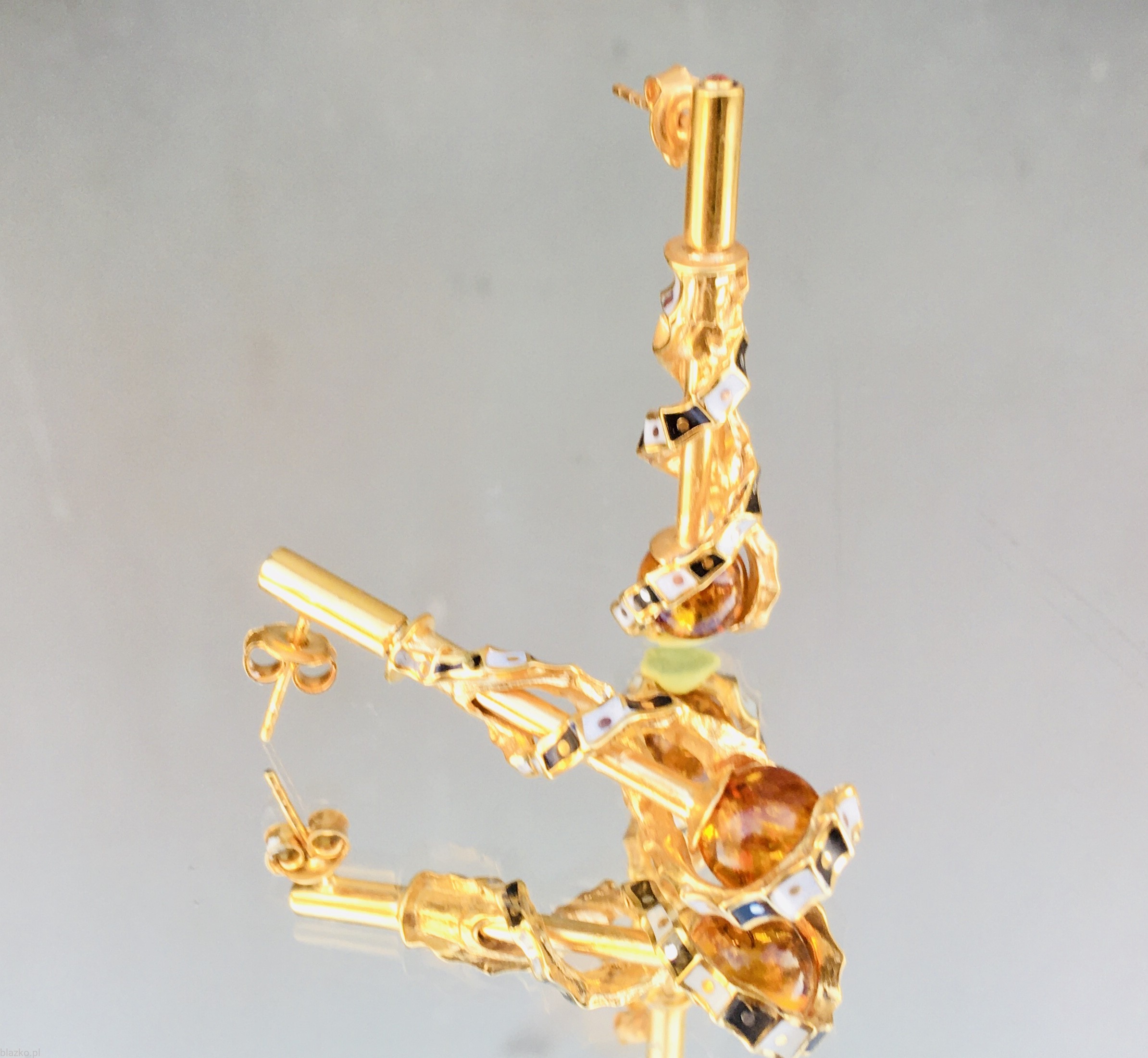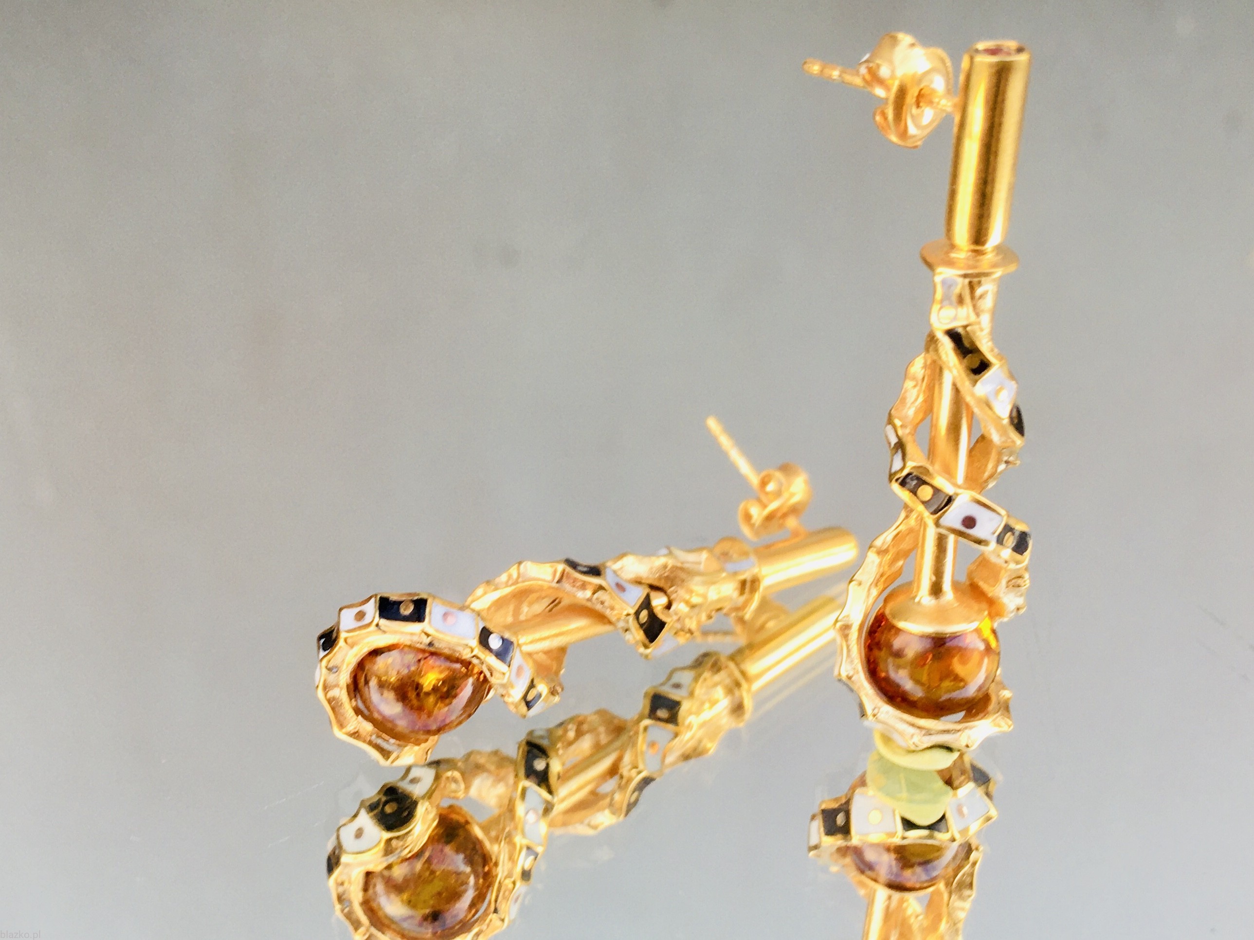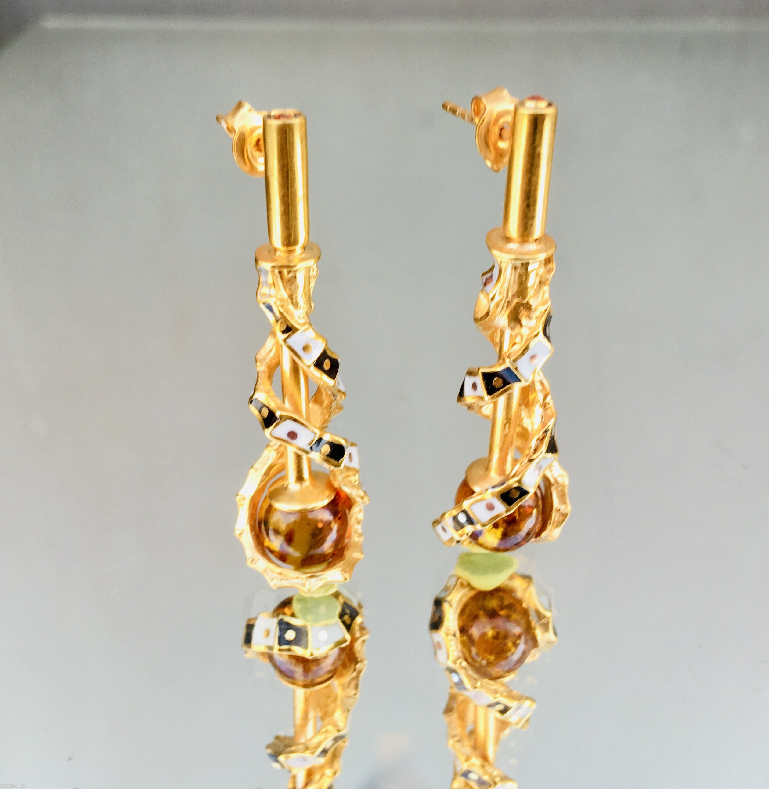 Unikatowe kolczyki w których spiralnie skręcona wstęga biało-czarnej szachownicy zamyka w swych objęciach drobną kuleczkę koniakowego bursztynu, unikatowa para wykonana ręcznie ze srebra, odrobiny miedzi i akryliku, w całości pokryta intensywna pozłotą, długość 4cm, szerokość do 1cm, waga 4,5 gr./szt.