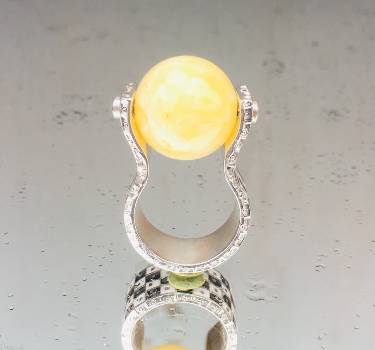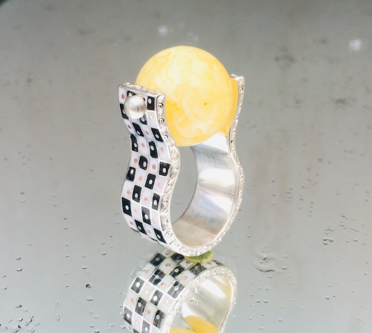 'Kulek' to unikatowy pierścionek składający się z 2 prawie-obrączek pokrytych biało-czarną szachownicą, jedna chwyta za palec druga podtrzymuje mleczną, bursztynową kulkę o średnicy ok. 18mm. Wykonany ręcznie ze srebra, kolorowego akryliku i odrobiny miedzi.