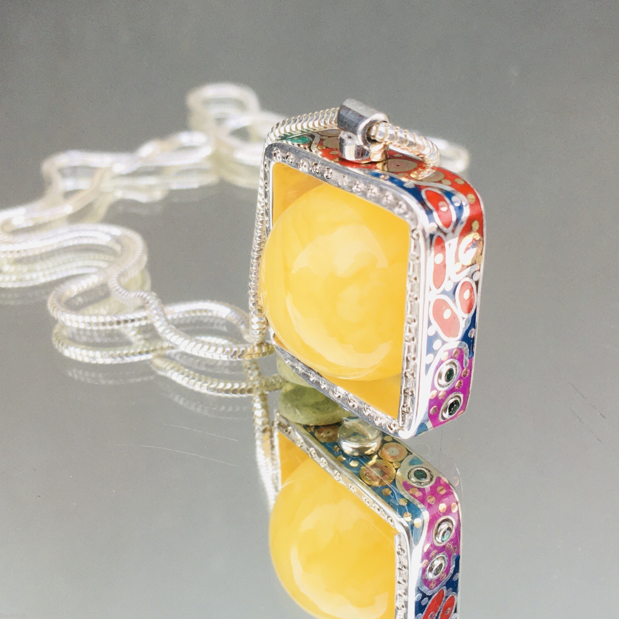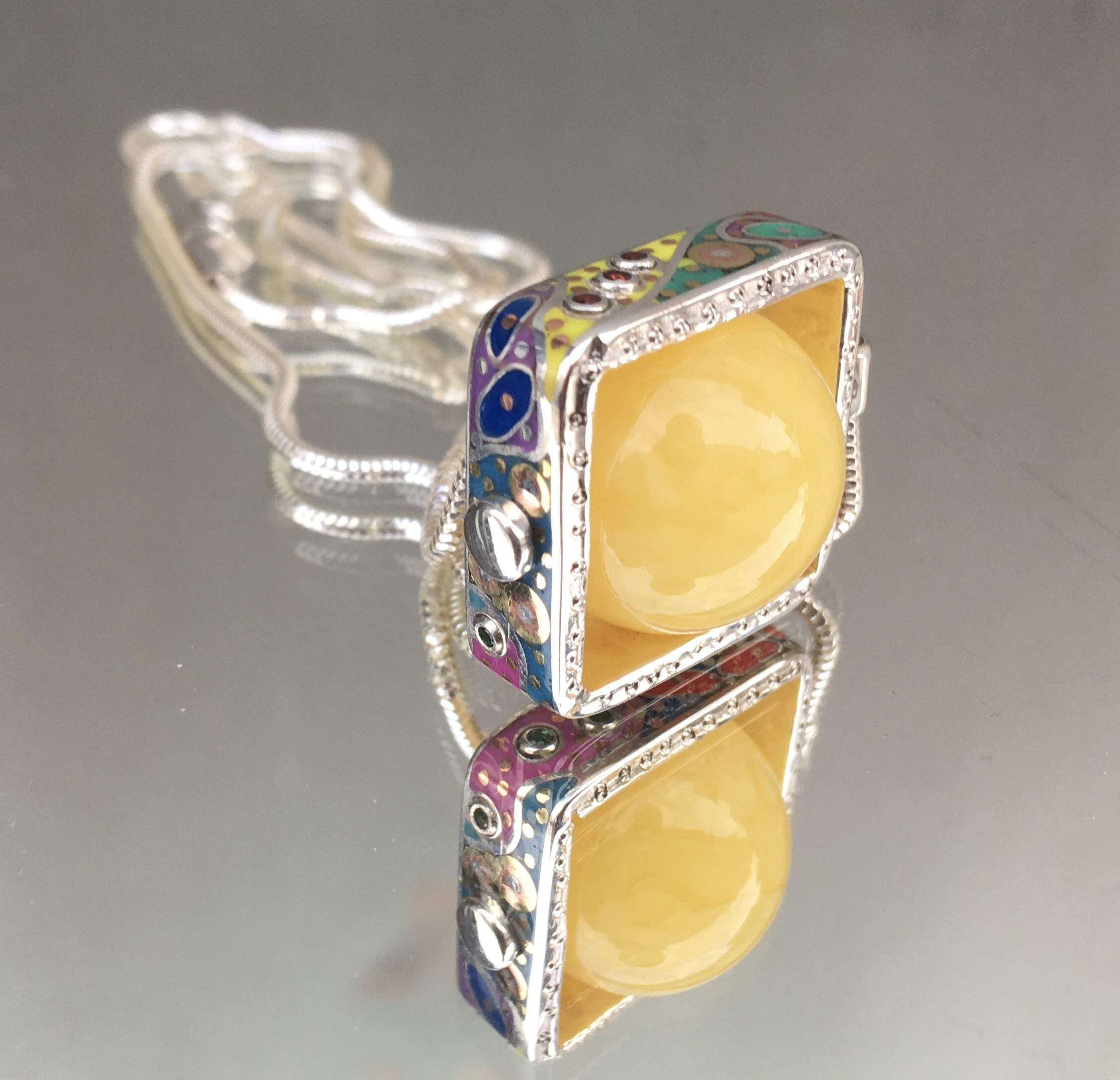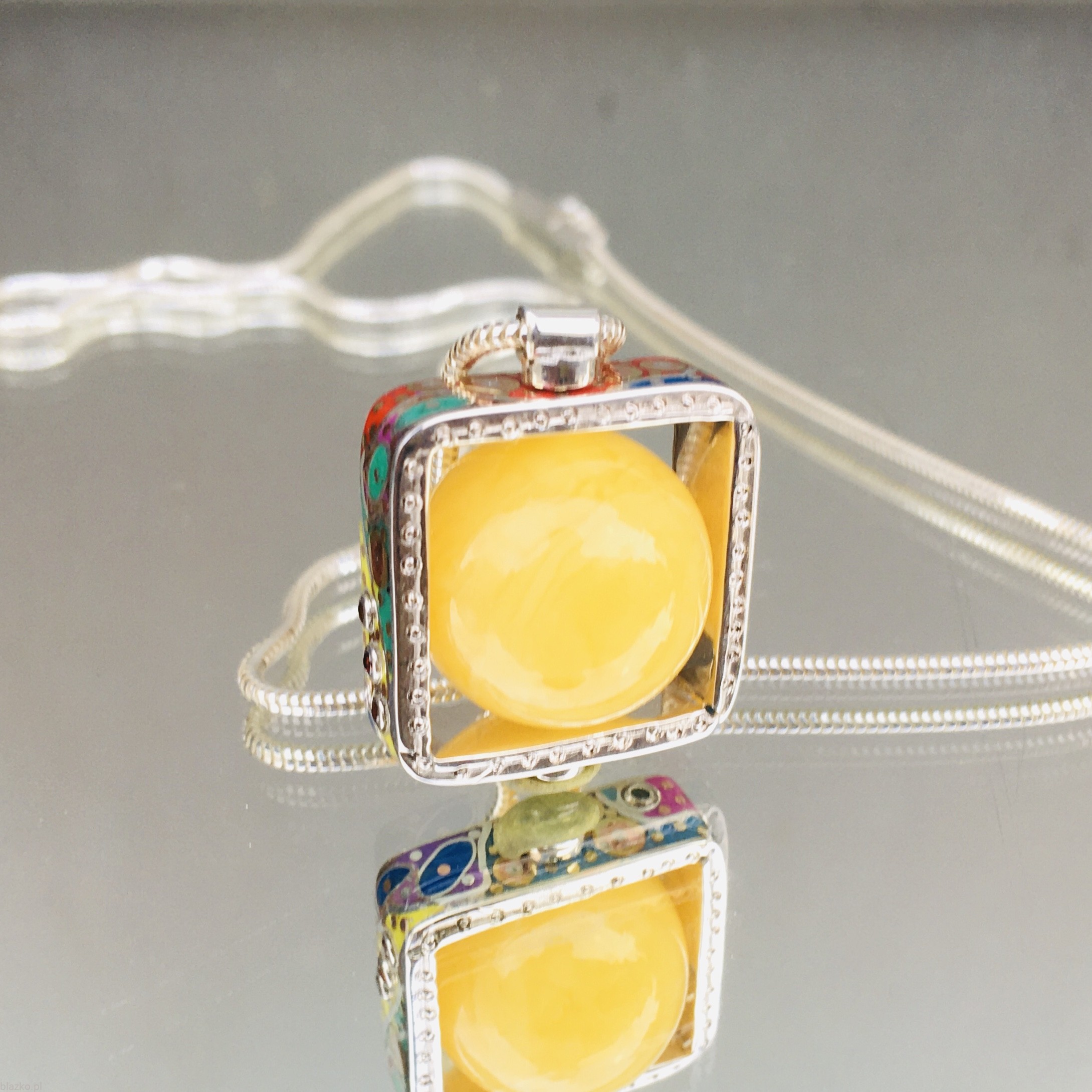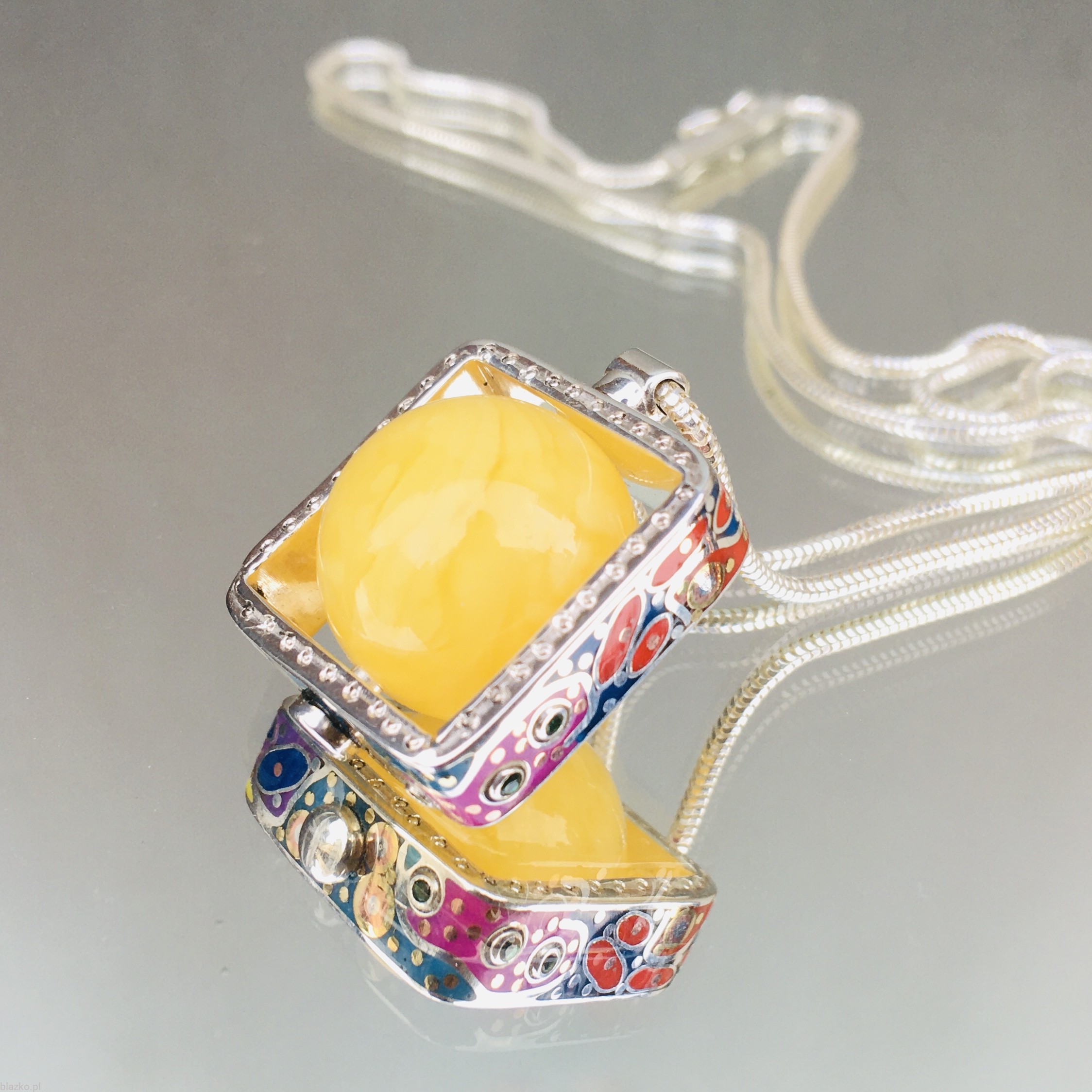 Unikatowy wisiorek z mlecznym bursztynem bałtyckim "oprawionym kwadratową obrączką zdobioną niepowtarzalnymi motywami kolorowej kolekcji DolceVita, zawieszoną na srebrnej żmijce. Wykonany ręcznie ze srebra, akryliku, odrobiny miedzi i mosiądzu i kilku maleńkich kryształków, powstał w jednym egz. widocznym na foto.