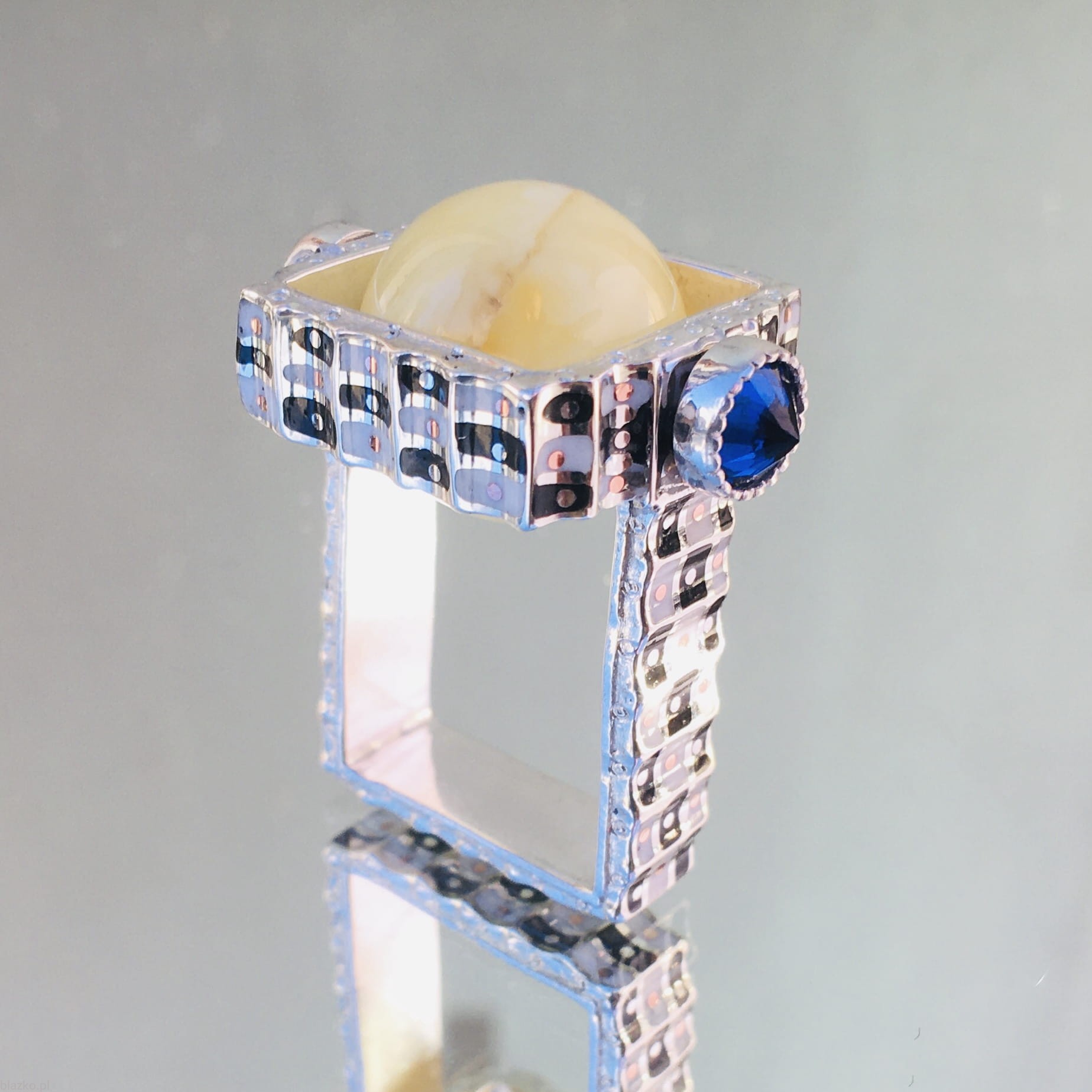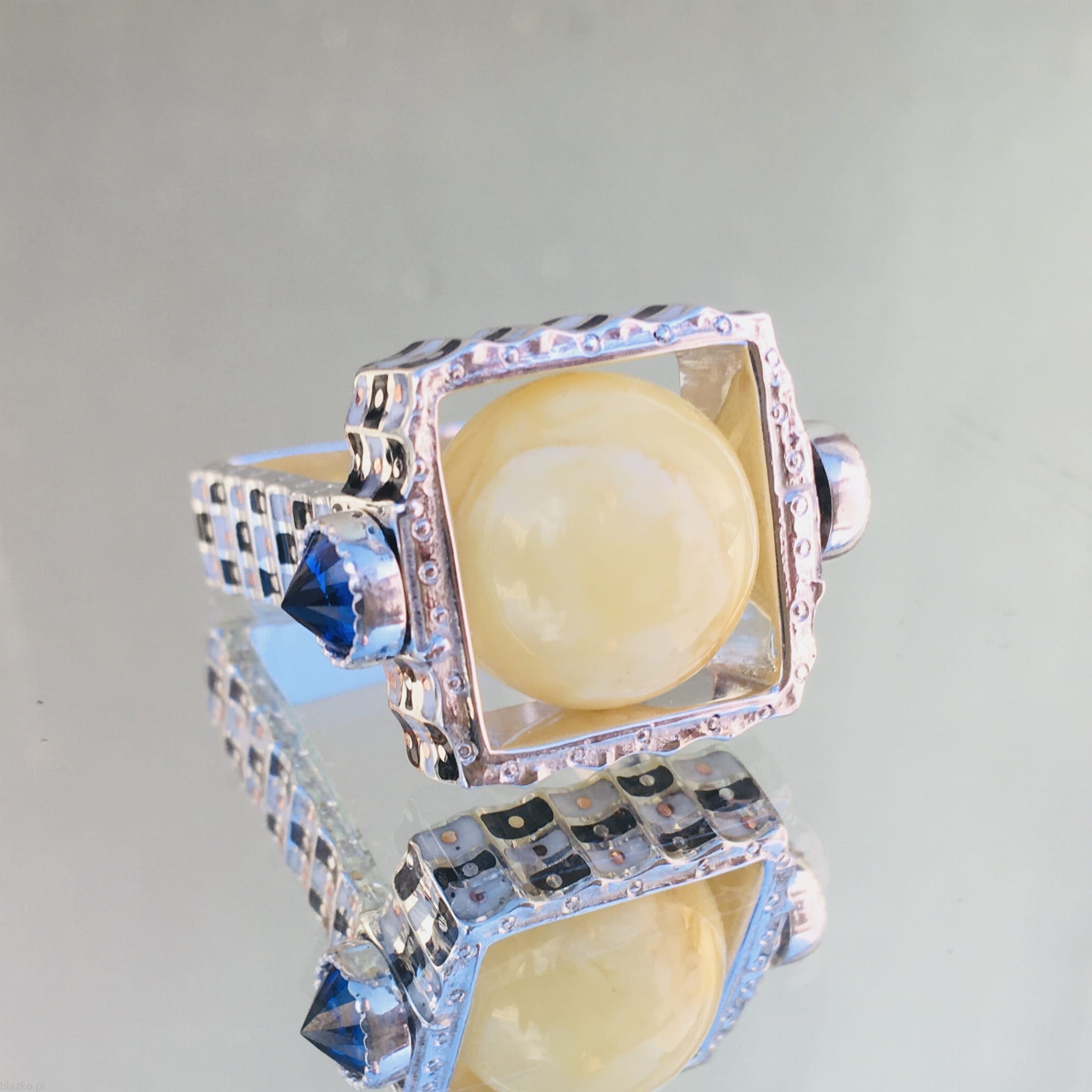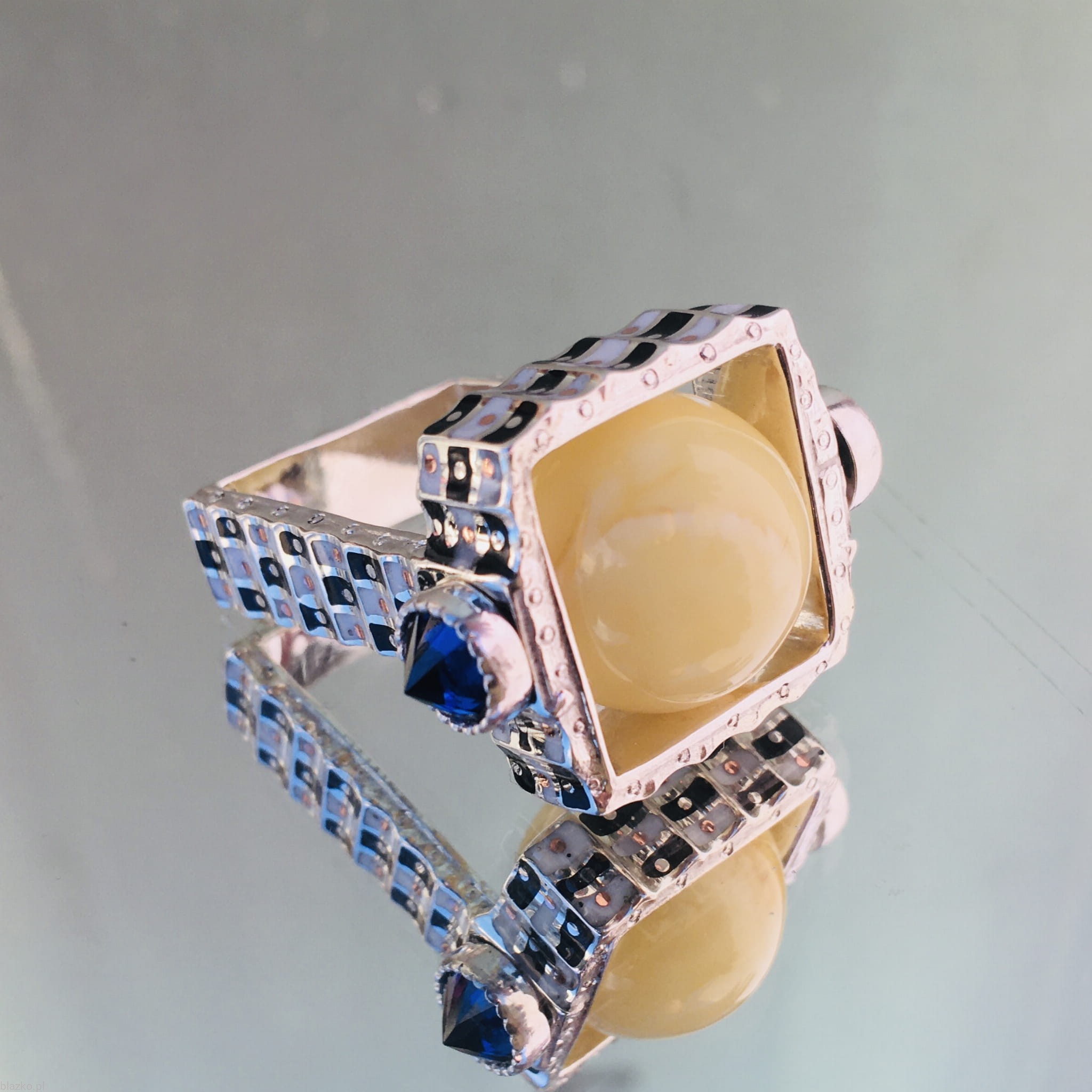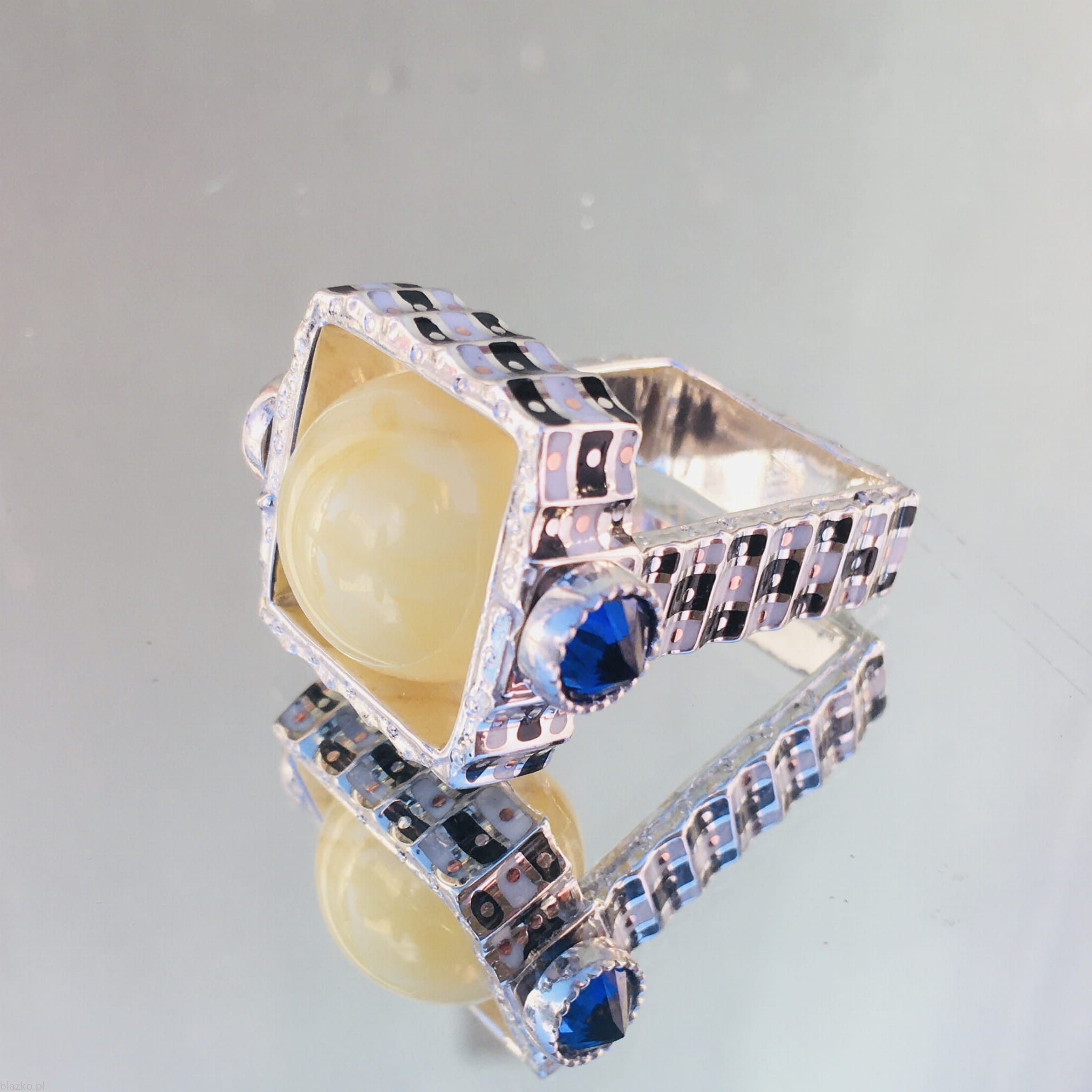 "Telewizorek" to delikatny - choć kwadratowy - pierścionek z mleczną bursztynową kuleczką (ok. 14mm średnicy) w kwadratowej ramce spiętej szafirowymi cyrkoniami, misternie gufrowane zewnętrzne powierzchnie pokryte wzorem biało-czarnej szachownicy.