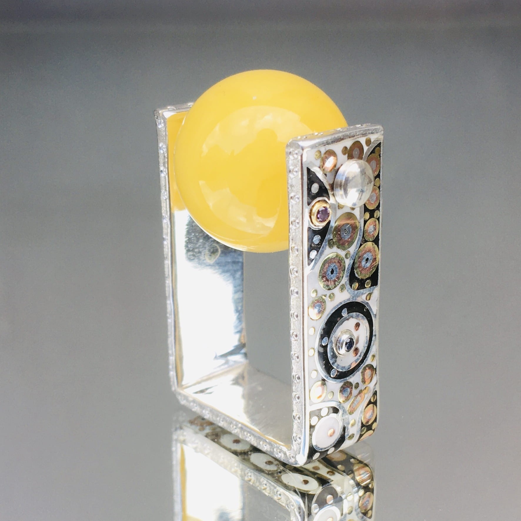 Kolejny unikatowy pierścień, w którym kwadratowa ramka obrączki o szerokości ok 1 cm pokryta niepowtarzalnymi wzorami kolekcji DolceVita tworzy podstawkę dla kuleczki z mlecznego bursztynu.