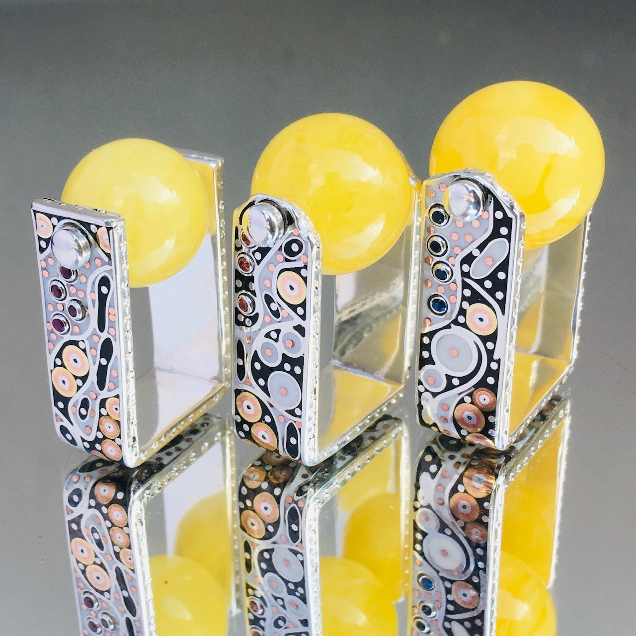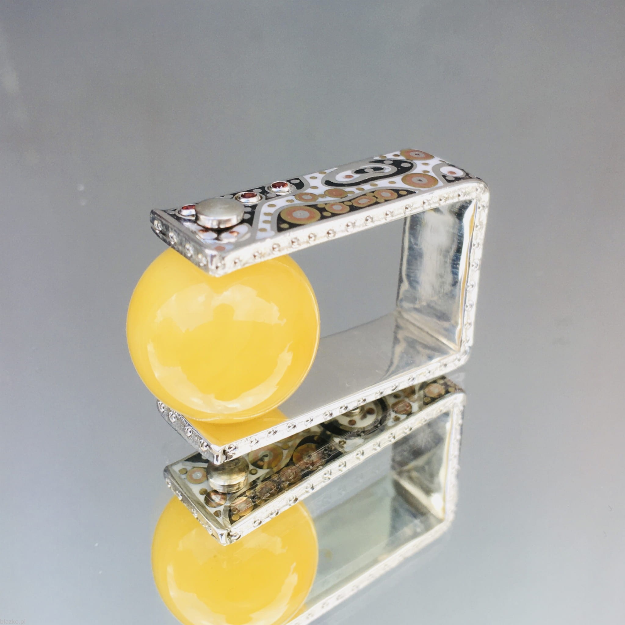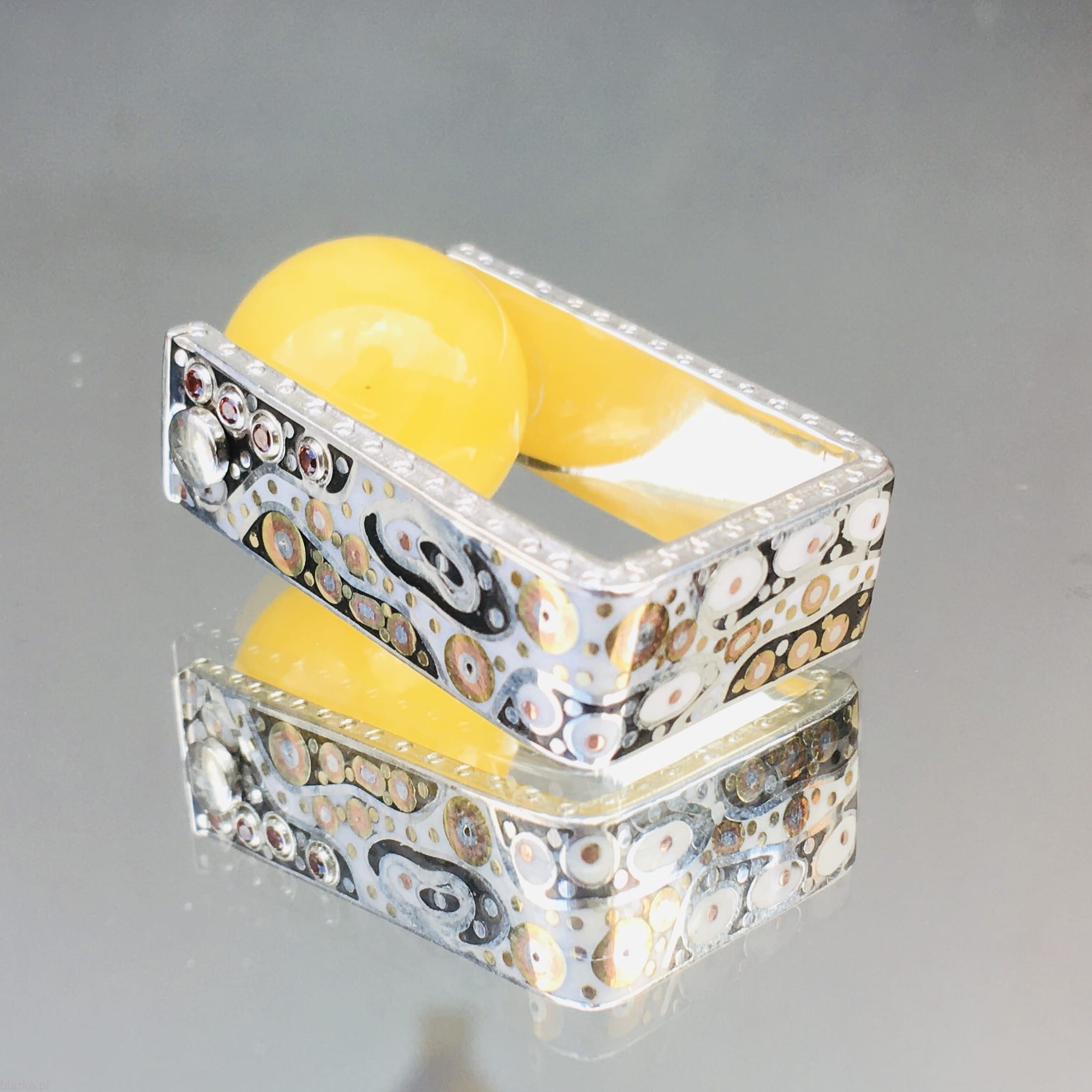 Wykonany ręcznie ze srebra, kolorowego akryliku z dodatkami miedzi i mosiądzu, drobniutkich cyrkonii i bałtyckiego bursztynu w intensywnym kolorze rzepakowego miodu. Dostepny od ręki w wersji widocznej na foto w podanym rozmiarze, inne rozmiary dostępne na zamówienie nie będą identyczne, ale utrzymane w zamyśle i podobnej kompozycji.